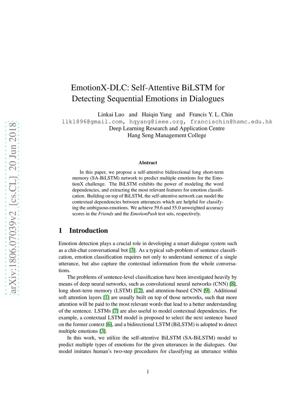 EmotionX-DLC: Self-Attentive BiLSTM for Detecting Sequential Emotions in