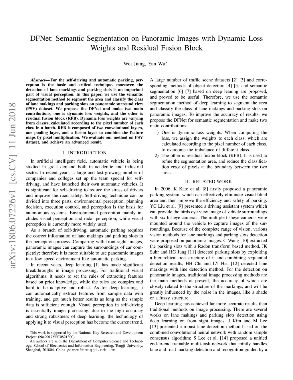 For the self-driving and automatic parking, perception is the basic and critical technique, moreover, the detection of lane markings and parking slots is an important part of visual perception. In this paper, we use the semantic segmentation method to segment the area and classify the class of lane makings and parking slots on panoramic surround view (PSV) dataset. We propose the DFNet and make two main contributions, one is dynamic loss weights, and the other is residual fusion block (RFB). Dynamic loss weights are varying from classes, calculated according to the pixel number of each class in a batch. RFB is composed of two convolutional layers, one pooling layer, and a fusion layer to combine the feature maps by pixel multiplication. We evaluate our method on PSV dataset, and achieve an advanced result.