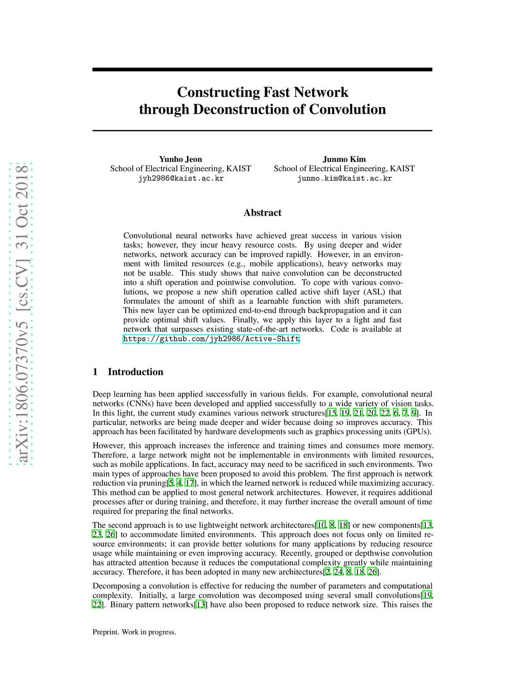Convolutional neural networks have achieved great success in various vision tasks; however, they incur heavy resource costs. By using deeper and wider networks, network accuracy can be improved rapidly. However, in an environment with limited resources (e.g., mobile applications), heavy networks may not be usable. This study shows that naive convolution can be deconstructed into a shift operation and pointwise convolution. To cope with various convolutions, we propose a new shift operation called active shift layer (ASL) that formulates the amount of shift as a learnable function with shift parameters. This new layer can be optimized end-to-end through backpropagation and it can provide optimal shift values. Finally, we apply this layer to a light and fast network that surpasses existing state-of-the-art networks.