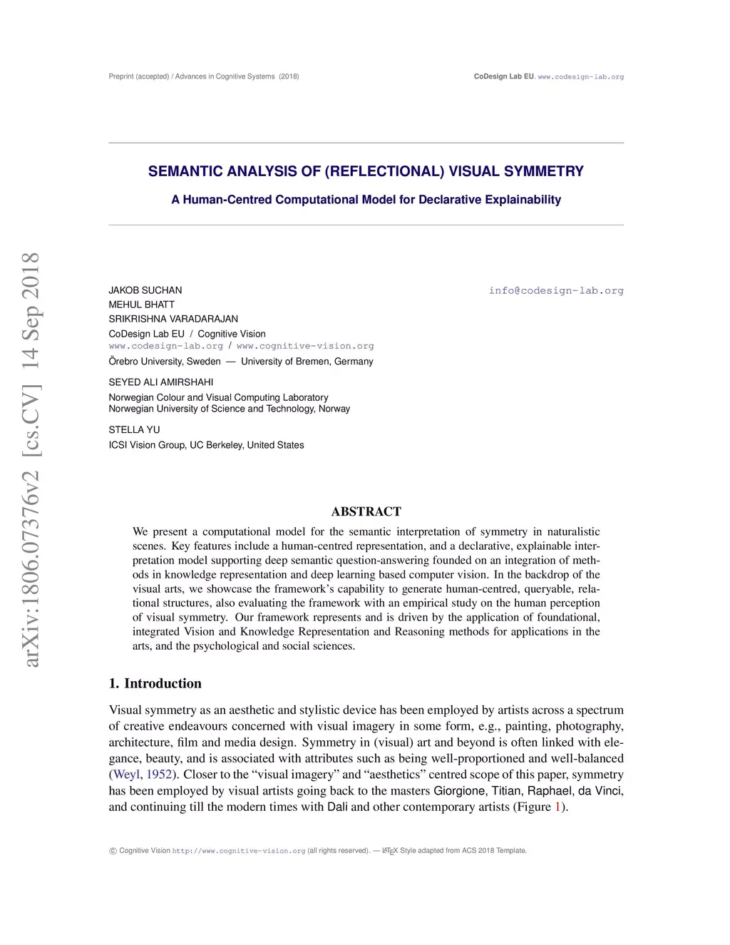 We present a computational model for the semantic interpretation of symmetry in naturalistic scenes. Key features include a human-centred representation, and a declarative, explainable interpretation model supporting deep semantic question-answering founded on an integration of methods in knowledge representation and deep learning based computer vision. In the backdrop of the visual arts, we showcase the framework's capability to generate human-centred, queryable, relational structures, also evaluating the framework with an empirical study on the human perception of visual symmetry. Our framework represents and is driven by the application of foundational, integrated Vision and Knowledge Representation and Reasoning methods for applications in the arts, and the psychological and social sciences.