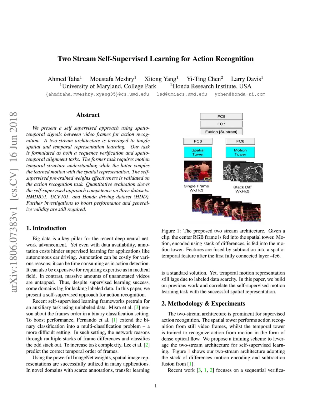 We present a self-supervised approach using spatio-temporal signals between video frames for action recognition. A two-stream architecture is leveraged to tangle spatial and temporal representation learning. Our task is formulated as both a sequence verification and spatio-temporal alignment tasks. The former task requires motion temporal structure understanding while the latter couples the learned motion with the spatial representation. The self-supervised pre-trained weights effectiveness is validated on the action recognition task. Quantitative evaluation shows the self-supervised approach competence on three datasets: HMDB51, UCF101, and Honda driving dataset (HDD). Further investigations to boost performance and generalize validity are still required.