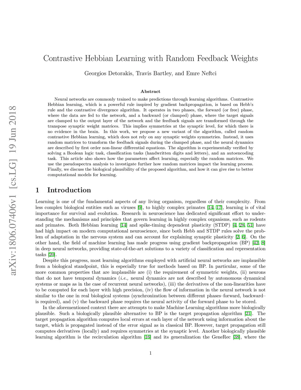 Neural networks are commonly trained to make predictions through learning algorithms. Contrastive Hebbian learning, which is a powerful rule inspired by gradient backpropagation, is based on Hebb's rule and the contrastive divergence algorithm. It operates in two phases, the forward (or free) phase, where the data are fed to the network, and a backward (or clamped) phase, where the target signals are clamped to the output layer of the network and the feedback signals are transformed through the transpose synaptic weight matrices. This implies symmetries at the synaptic level, for which there is no evidence in the brain. In this work, we propose a new variant of the algorithm, called random contrastive Hebbian learning, which does not rely on any synaptic weights symmetries. Instead, it uses random matrices to transform the feedback signals during the clamped phase, and the neural dynamics are described by first order non-linear differential equations. The algorithm is experimentally verified by solving a Boolean logic task, classification tasks (handwritten digits and letters), and an autoencoding task. This article also shows how the parameters affect learning, especially the random matrices. We use the pseudospectra analysis to investigate further how random matrices impact the learning process. Finally, we discuss the biological plausibility of the proposed algorithm, and how it can give rise to better computational models for learning.