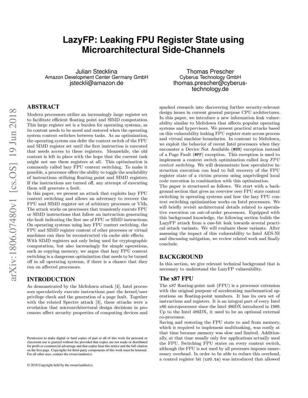 LazyFP: Leaking FPU Register State using Microarchitectural