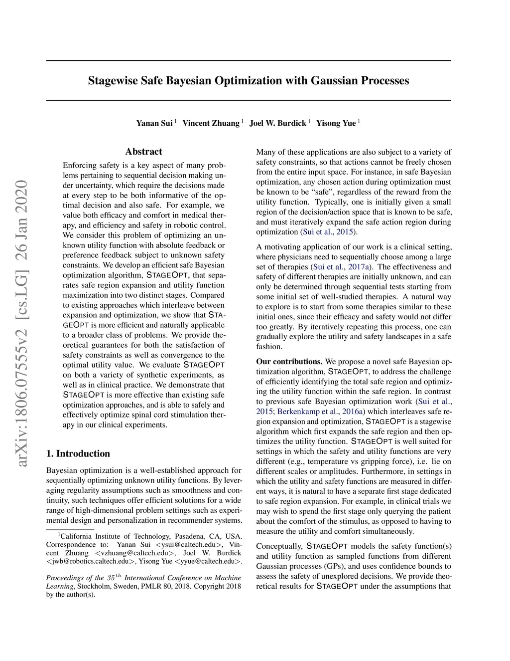 Enforcing safety is a key aspect of many problems pertaining to sequential decision making under uncertainty, which require the decisions made at every step to be both informative of the optimal decision and also safe. For example, we value both efficacy and comfort in medical therapy, and efficiency and safety in robotic control. We consider this problem of optimizing an unknown utility function with absolute feedback or preference feedback subject to unknown safety constraints. We develop an efficient safe Bayesian optimization algorithm, StageOpt, that separates safe region expansion and utility function maximization into two distinct stages. Compared to existing approaches which interleave between expansion and optimization, we show that StageOpt is more efficient and naturally applicable to a broader class of problems. We provide theoretical guarantees for both the satisfaction of safety constraints as well as convergence to the optimal utility value. We evaluate StageOpt on both a variety of synthetic experiments, as well as in clinical practice. We demonstrate that StageOpt is more effective than existing safe optimization approaches, and is able to safely and effectively optimize spinal cord stimulation therapy in our clinical experiments.