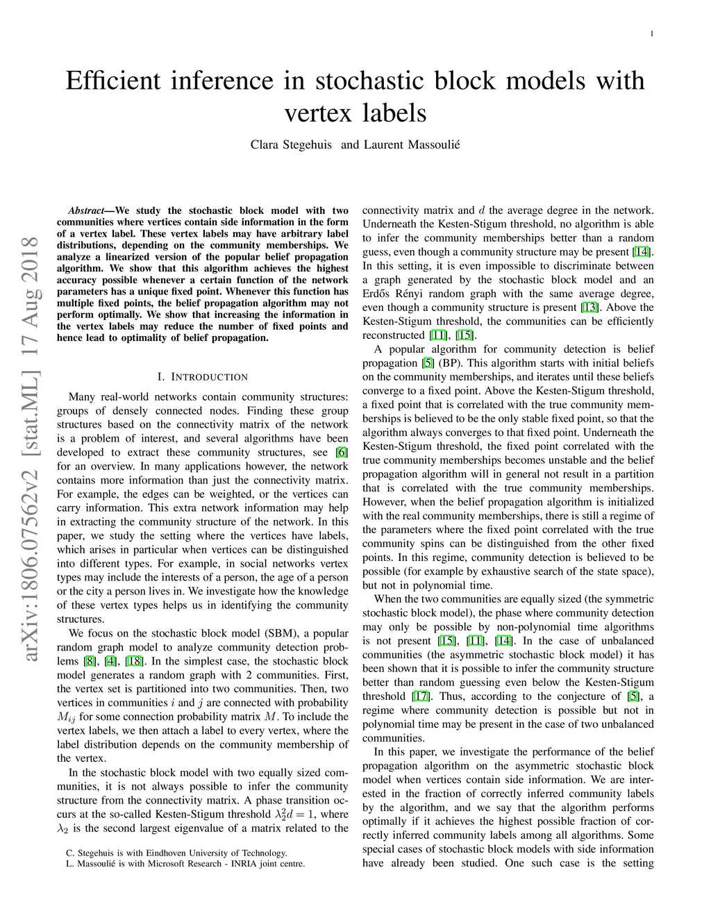 We study the stochastic block model with two communities where vertices contain side information in the form of a vertex label. These vertex labels may have arbitrary label distributions, depending on the community memberships. We analyze a linearized version of the popular belief propagation algorithm. We show that this algorithm achieves the highest accuracy possible whenever a certain function of the network parameters has a unique fixed point. Whenever this function has multiple fixed points, the belief propagation algorithm may not perform optimally. We show that increasing the information in the vertex labels may reduce the number of fixed points and hence lead to optimality of belief propagation.