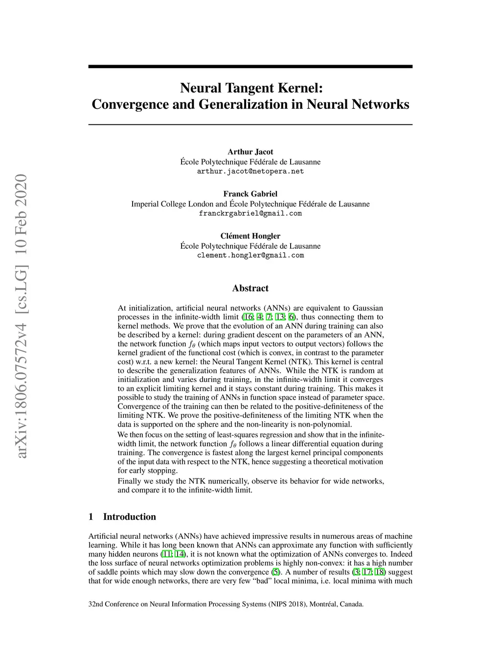 At initialization, artificial neural networks (ANNs) are equivalent to Gaussian processes in the infinite-width limit, thus connecting them to kernel methods. We prove that the evolution of an ANN during training can also be described by a kernel: during gradient descent on the parameters of an ANN, the network function (which maps input vectors to output vectors) follows the kernel gradient of the functional cost (which is convex, in contrast to the parameter cost) w.r.t. a new kernel: the Neural Tangent Kernel (NTK). This kernel is central to describe the generalization features of ANNs. While the NTK is random at initialization and varies during training, in the infinite-width limit it converges to an explicit limiting kernel and it stays constant during training. This makes it possible to study the training of ANNs in function space instead of parameter space. Convergence of the training can then be related to the positive-definiteness of the limiting NTK. We then focus on the setting of least-squares regression and show that in the infinite-width limit, the network function follows a linear differential equation during training. The convergence is fastest along the largest kernel principal components of the input data with respect to the NTK, hence suggesting a theoretical motivation for early stopping. Finally we study the NTK numerically, observe its behavior for wide networks, and compare it to the infinite-width limit.