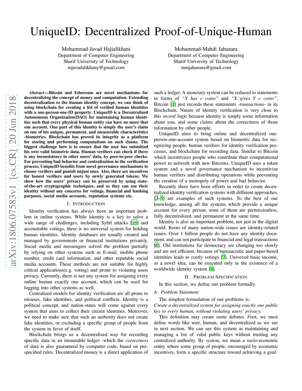 Bitcoin and Ethereum are novel mechanisms for decentralizing the concept of money and computation. Extending decentralization to the human identity concept, we can think of using blockchain for creating a list of verified human identities with a one-person-one-ID property. UniqueID is a Decentralized Autonomous Organization(DAO) for maintaining human identities such that every physical human entity can have no more that one account. One part of this identity is simply the user's claim on one of his unique, permanent, and measurable characteristics -biometrics. Blockchain has proved its integrity as a platform for storing and performing computations on such claims. The biggest challenge here is to ensure that the user has submitted his own valid biometric data. Human verifiers can check if there is any inconsistency in other users' data, by peer-to-peer checks. For preventing bad behavior and centralization in the verification process, UniqueID benefits from novel governance mechanisms to choose verifiers and punish unjust ones. Also, there are incentives for honest verifiers and users by newly generated tokens. We show how the users' privacy can be preserved by using state-of-the-art cryptographic techniques, and so they can use their identity without any concerns for votings, financial and banking purposes, social media accounts, reputation systems etc.