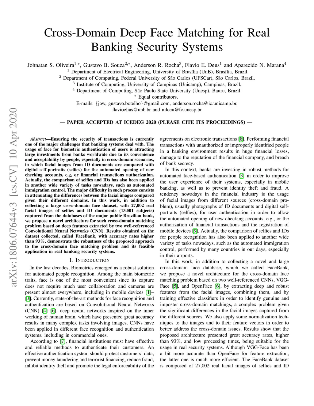 Ensuring the security of transactions is currently one of the major challenges that banking systems deal with. The usage of face for biometric authentication of users is attracting large investments from banks worldwide due to its convenience and acceptability by people, especially in cross-domain scenarios, in which facial images from ID documents are compared with digital self-portraits (selfies) for the automated opening of new checking accounts, e.g, or financial transactions authorization. Actually, the comparison of selfies and IDs has also been applied in another wide variety of tasks nowadays, such as automated immigration control. The major difficulty in such process consists in attenuating the differences between the facial images compared given their different domains. In this work, in addition to collecting a large cross-domain face dataset, with 27,002 real facial images of selfies and ID documents (13,501 subjects) captured from the databases of the major public Brazilian bank, we propose a novel architecture for such cross-domain matching problem based on deep features extracted by two well-referenced Convolutional Neural Networks (CNN). Results obtained on the dataset collected, called FaceBank, with accuracy rates higher than 93%, demonstrate the robustness of the proposed approach to the cross-domain face matching problem and its feasible application in real banking security systems.