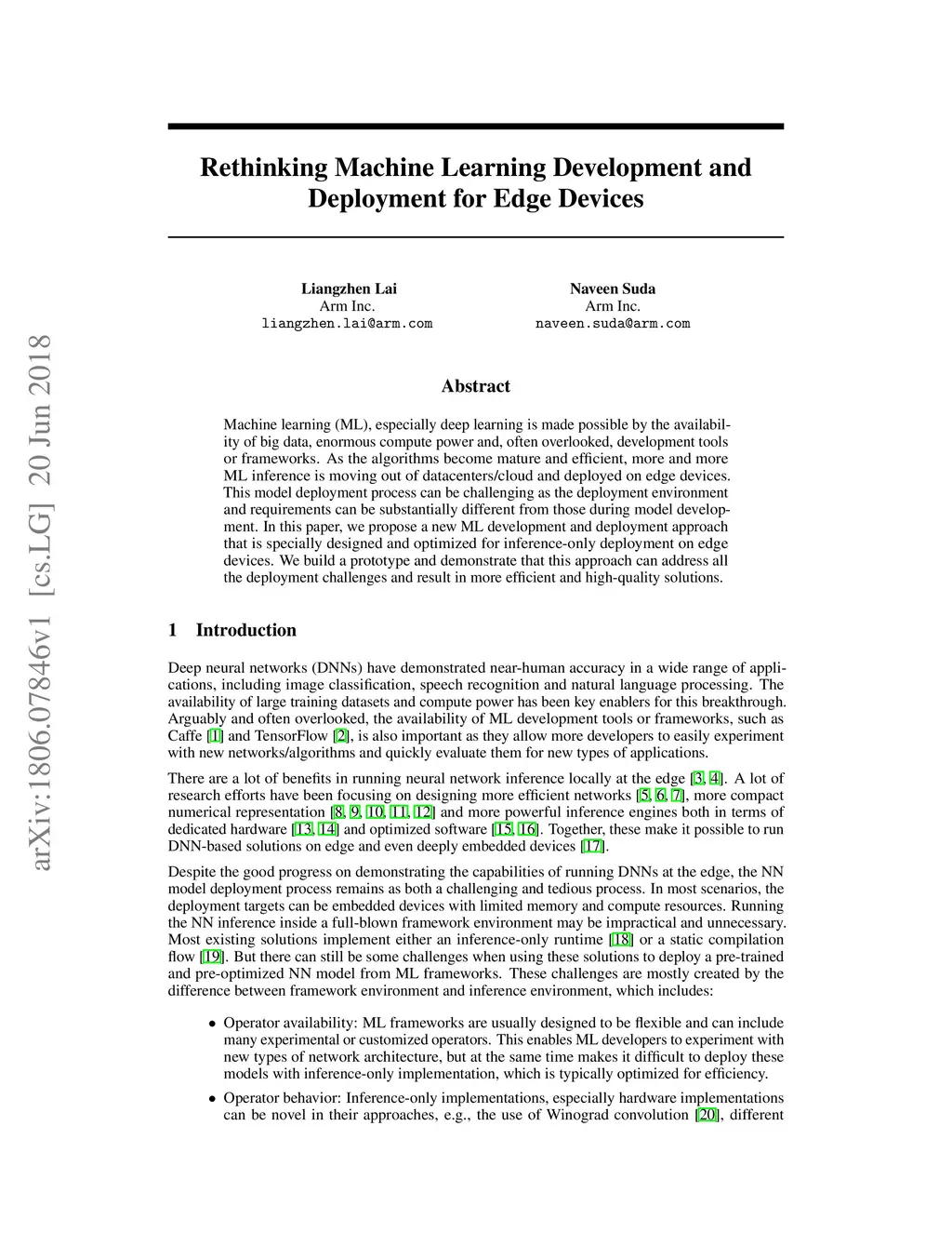 Machine learning (ML), especially deep learning is made possible by the availability of big data, enormous compute power and, often overlooked, development tools or frameworks. As the algorithms become mature and efficient, more and more ML inference is moving out of datacenters/cloud and deployed on edge devices. This model deployment process can be challenging as the deployment environment and requirements can be substantially different from those during model development. In this paper, we propose a new ML development and deployment approach that is specially designed and optimized for inference-only deployment on edge devices. We build a prototype and demonstrate that this approach can address all the deployment challenges and result in more efficient and high-quality solutions.