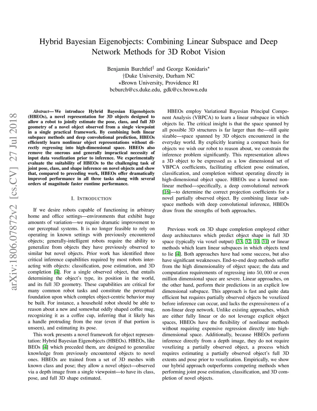 We introduce Hybrid Bayesian Eigenobjects (HBEOs), a novel representation for 3D objects designed to allow a robot to jointly estimate the pose, class, and full 3D geometry of a novel object observed from a single viewpoint in a single practical framework. By combining both linear subspace methods and deep convolutional prediction, HBEOs efficiently learn nonlinear object representations without directly regressing into high-dimensional space. HBEOs also remove the onerous and generally impractical necessity of input data voxelization prior to inference. We experimentally evaluate the suitability of HBEOs to the challenging task of joint pose, class, and shape inference on novel objects and show that, compared to preceding work, HBEOs offer dramatically improved performance in all three tasks along with several orders of magnitude faster runtime performance.