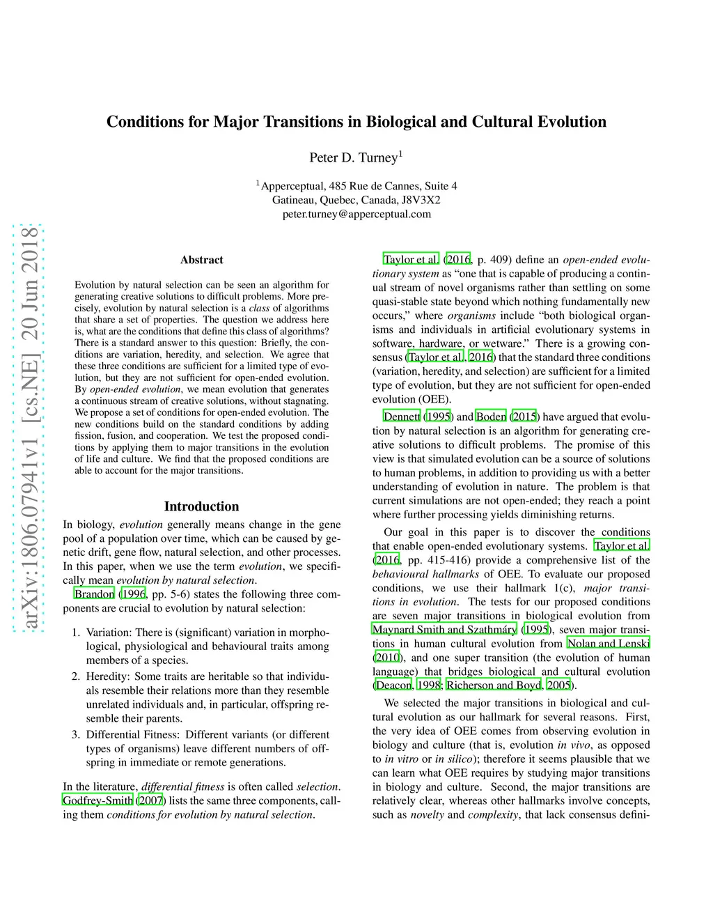 Evolution by natural selection can be seen an algorithm for generating creative solutions to difficult problems. More precisely, evolution by natural selection is a class of algorithms that share a set of properties. The question we address here is, what are the conditions that define this class of algorithms? There is a standard answer to this question: Briefly, the conditions are variation, heredity, and selection. We agree that these three conditions are sufficient for a limited type of evolution, but they are not sufficient for open-ended evolution. By open-ended evolution, we mean evolution that generates a continuous stream of creative solutions, without stagnating. We propose a set of conditions for open-ended evolution. The new conditions build on the standard conditions by adding fission, fusion, and cooperation. We test the proposed conditions by applying them to major transitions in the evolution of life and culture. We find that the proposed conditions are able to account for the major transitions.