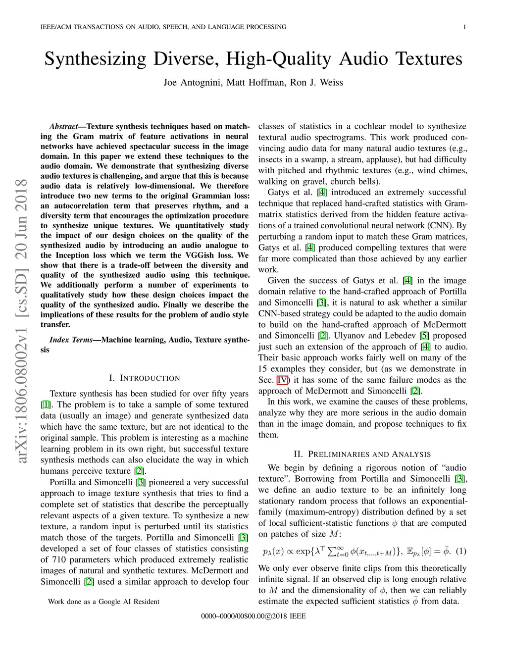 Texture synthesis techniques based on matching the Gram matrix of feature activations in neural networks have achieved spectacular success in the image domain. In this paper we extend these techniques to the audio domain. We demonstrate that synthesizing diverse audio textures is challenging, and argue that this is because audio data is relatively low-dimensional. We therefore introduce two new terms to the original Grammian loss: an autocorrelation term that preserves rhythm, and a diversity term that encourages the optimization procedure to synthesize unique textures. We quantitatively study the impact of our design choices on the quality of the synthesized audio by introducing an audio analogue to the Inception loss which we term the VGGish loss. We show that there is a trade-off between the diversity and quality of the synthesized audio using this technique. We additionally perform a number of experiments to qualitatively study how these design choices impact the quality of the synthesized audio. Finally we describe the implications of these results for the problem of audio style transfer.