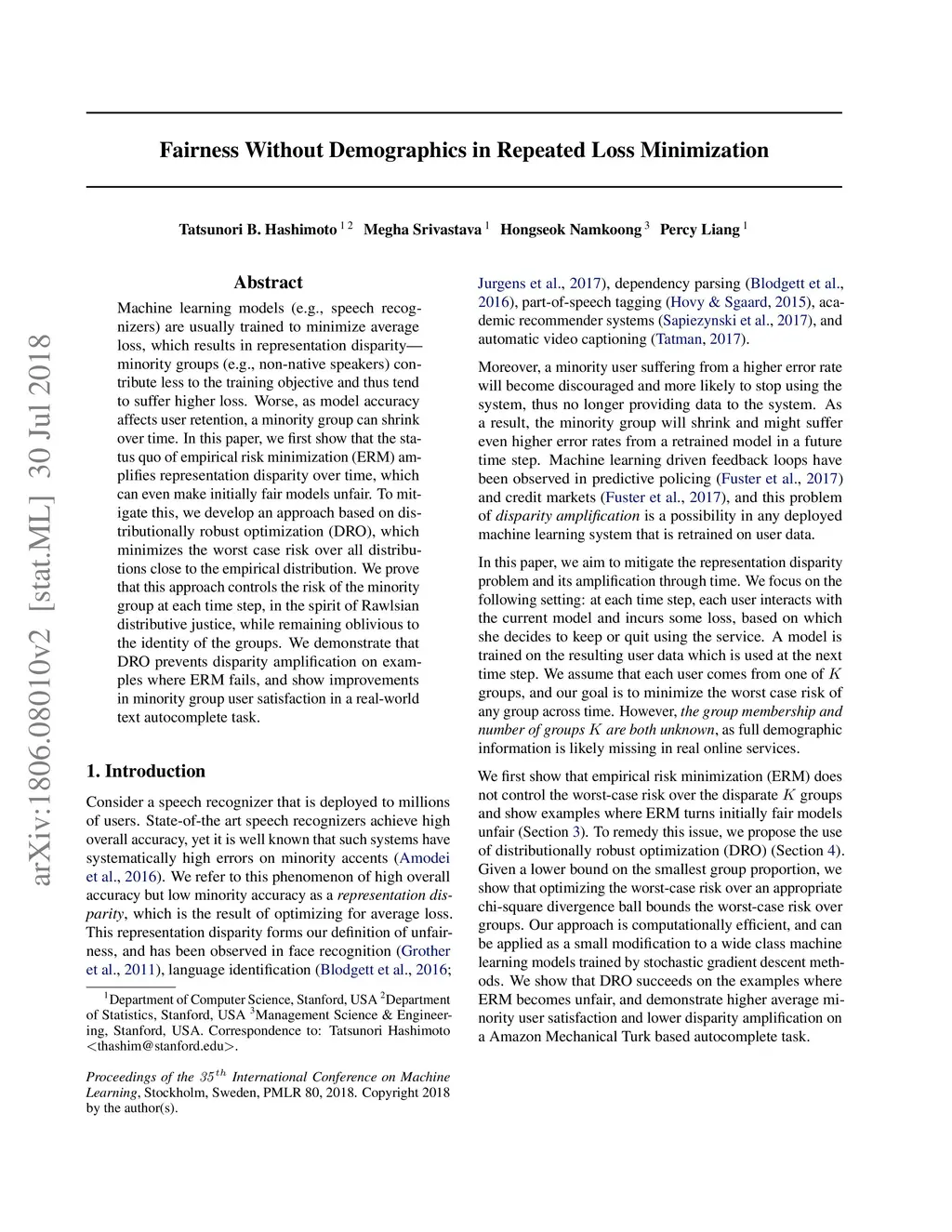 Machine learning models (e.g., speech recognizers) are usually trained to minimize average loss, which results in representation disparity---minority groups (e.g., non-native speakers) contribute less to the training objective and thus tend to suffer higher loss. Worse, as model accuracy affects user retention, a minority group can shrink over time. In this paper, we first show that the status quo of empirical risk minimization (ERM) amplifies representation disparity over time, which can even make initially fair models unfair. To mitigate this, we develop an approach based on distributionally robust optimization (DRO), which minimizes the worst case risk over all distributions close to the empirical distribution. We prove that this approach controls the risk of the minority group at each time step, in the spirit of Rawlsian distributive justice, while remaining oblivious to the identity of the groups. We demonstrate that DRO prevents disparity amplification on examples where ERM fails, and show improvements in minority group user satisfaction in a real-world text autocomplete task.