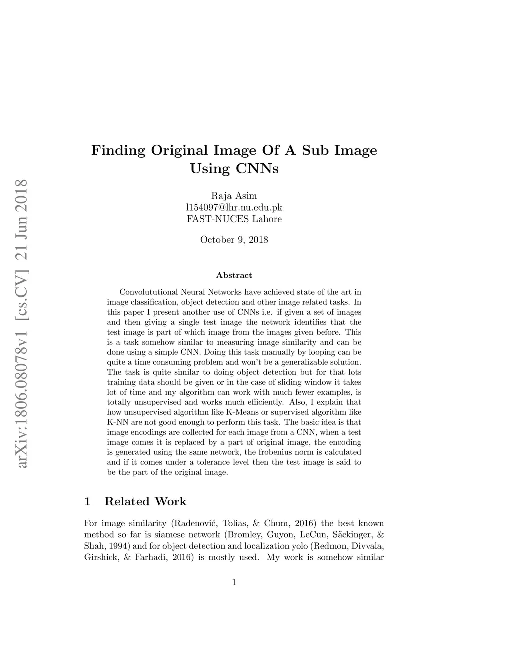 Convolututional Neural Networks have achieved state of the art in image classification, object detection and other image related tasks. In this paper I present another use of CNNs i.e. if given a set of images and then giving a single test image the network identifies that the test image is part of which image from the images given before. This is a task somehow similar to measuring image similarity and can be done using a simple CNN. Doing this task manually by looping can be quite a time consuming problem and won't be a generalizable solution. The task is quite similar to doing object detection but for that lots training data should be given or in the case of sliding window it takes lot of time and my algorithm can work with much fewer examples, is totally unsupervised and works much efficiently. Also, I explain that how unsupervised algorithm like K-Means or supervised algorithm like K-NN are not good enough to perform this task. The basic idea is that image encodings are collected for each image from a CNN, when a test image comes it is replaced by a part of original image, the encoding is generated using the same network, the frobenius norm is calculated and if it comes under a tolerance level then the test image is said to be the part of the original image.