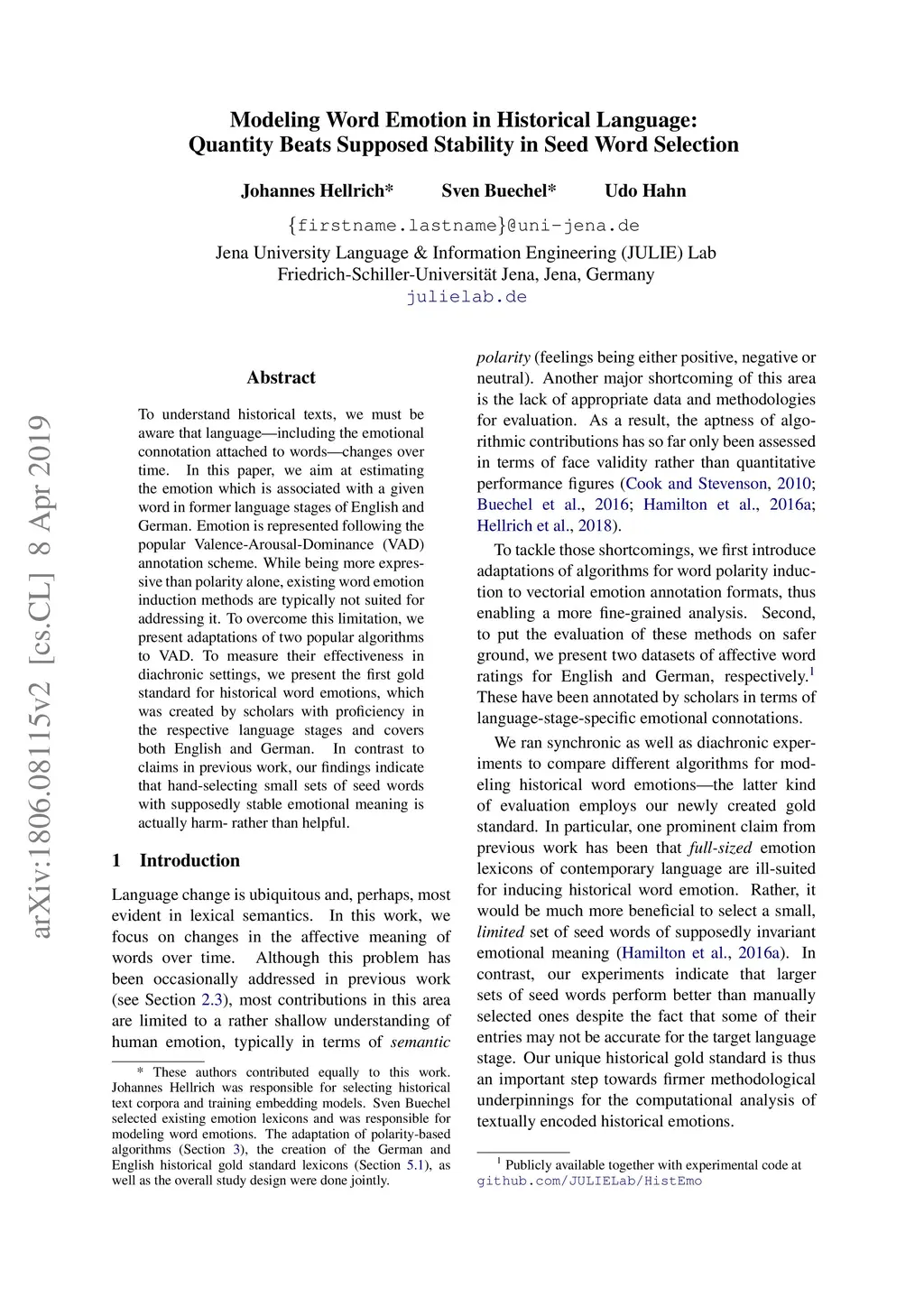 Modeling Word Emotion in Historical Language: Quantity Beats Supposed