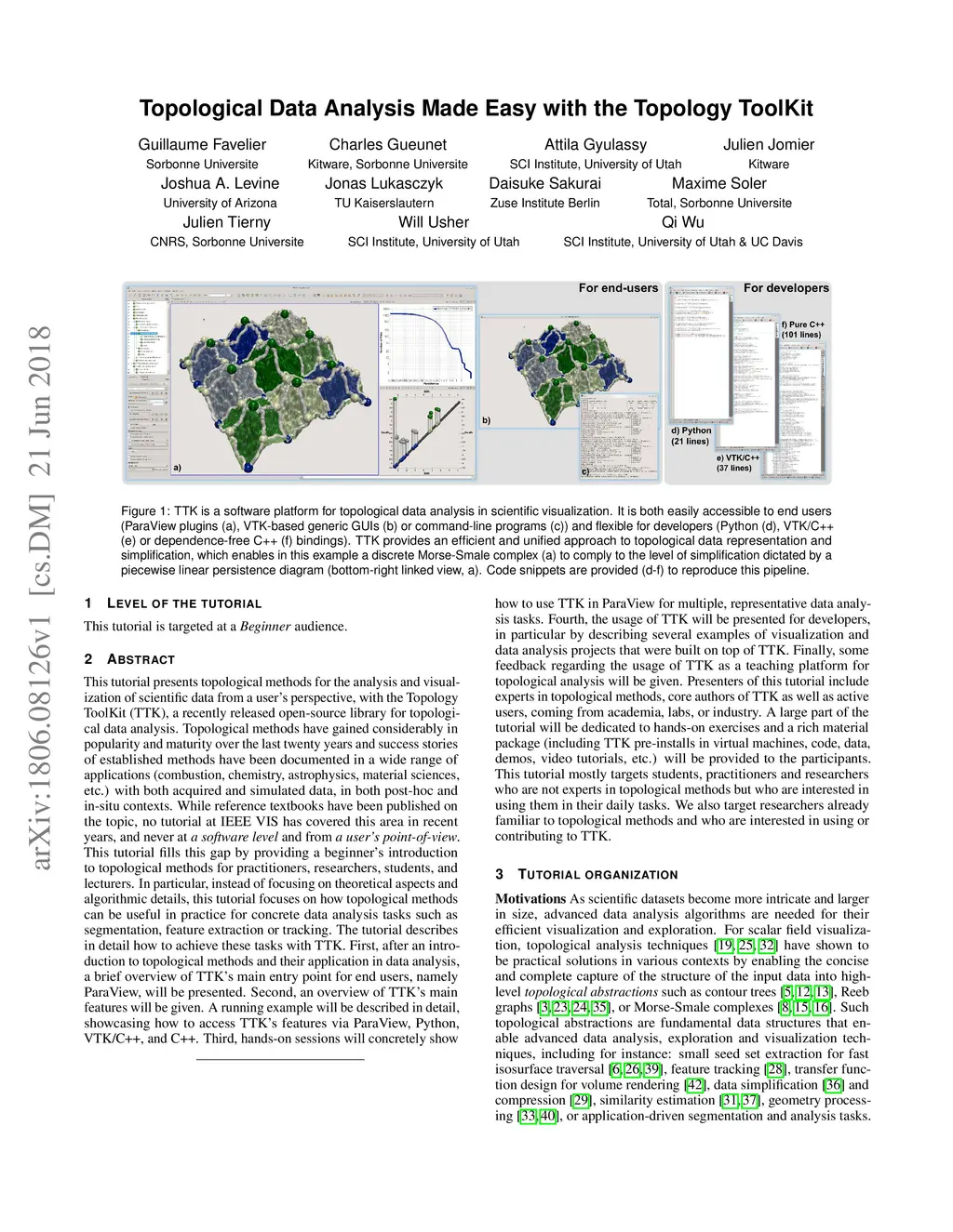 This tutorial presents topological methods for the analysis and visualization of scientific data from a user's perspective, with the Topology ToolKit (TTK), a recently released open-source library for topological data analysis. Topological methods have gained considerably in popularity and maturity over the last twenty years and success stories of established methods have been documented in a wide range of applications (combustion, chemistry, astrophysics, material sciences, etc.) with both acquired and simulated data, in both post-hoc and in-situ contexts. While reference textbooks have been published on the topic, no tutorial at IEEE VIS has covered this area in recent years, and never at a software level and from a user's point-of-view. This tutorial fills this gap by providing a beginner's introduction to topological methods for practitioners, researchers, students, and lecturers. In particular, instead of focusing on theoretical aspects and algorithmic details, this tutorial focuses on how topological methods can be useful in practice for concrete data analysis tasks such as segmentation, feature extraction or tracking. The tutorial describes in detail how to achieve these tasks with TTK. First, after an introduction to topological methods and their application in data analysis, a brief overview of TTK's main entry point for end users, namely ParaView, will be presented. Second, an overview of TTK's main features will be given. A running example will be described in detail, showcasing how to access TTK's features via ParaView, Python, VTK/C++, and C++. Third, hands-on sessions will concretely show how to use TTK in ParaView for multiple, representative data analysis tasks. Fourth, the usage of TTK will be presented for developers, in particular by describing several examples of visualization and data analysis projects that were built on top of TTK. Finally, some feedback regarding the usage of TTK as a teaching platform for topological analysis will be given. Presenters of this tutorial include experts in topological methods, core authors of TTK as well as active users, coming from academia, labs, or industry. A large part of the tutorial will be dedicated to hands-on exercises and a rich material package (including TTK pre-installs in virtual machines, code, data, demos, video tutorials, etc.) will be provided to the participants. This tutorial mostly targets students, practitioners and researchers who are not experts in topological methods but who are interested in using them in their daily tasks. We also target researchers already familiar to topological methods and who are interested in using or contributing to TTK.