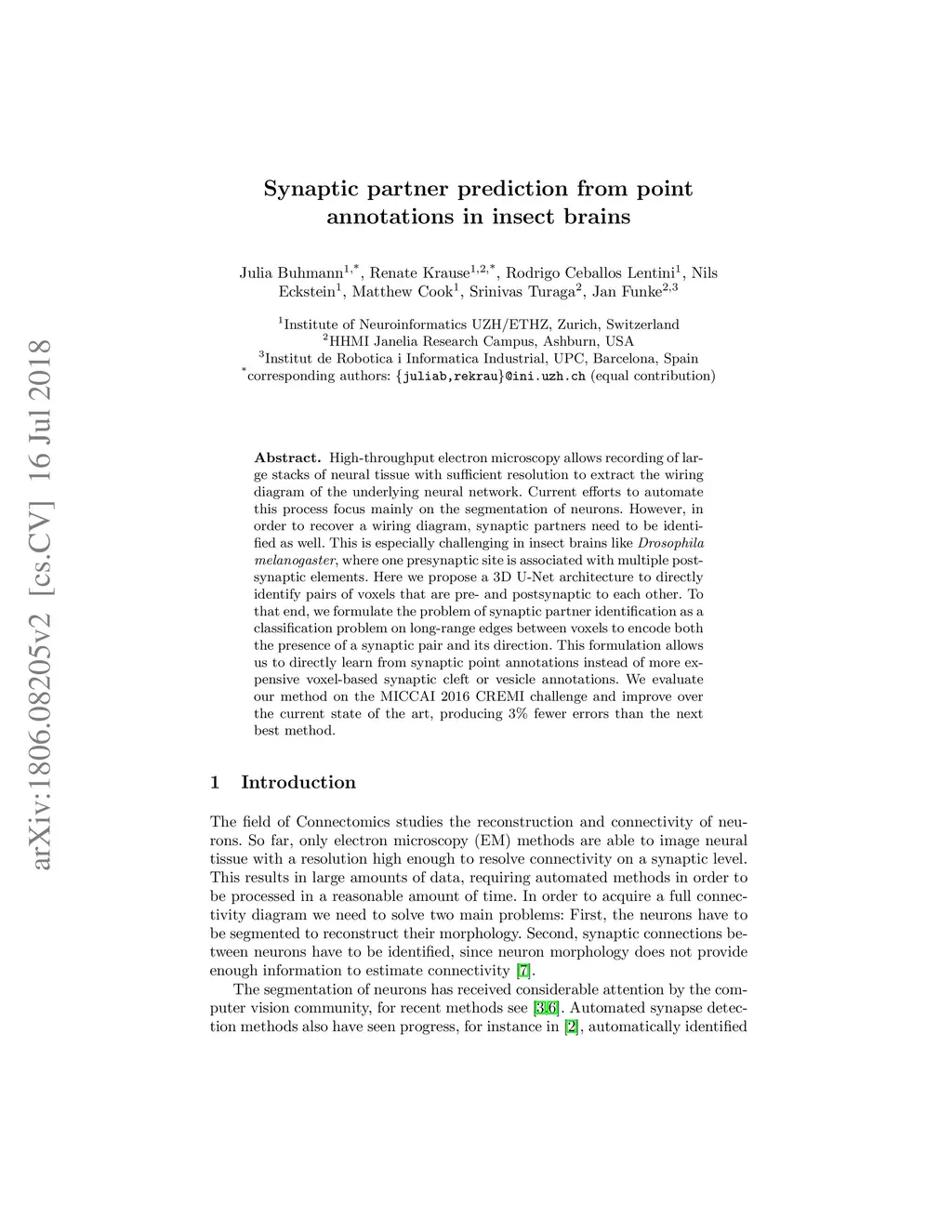 High-throughput electron microscopy allows recording of lar- ge stacks of neural tissue with sufficient resolution to extract the wiring diagram of the underlying neural network. Current efforts to automate this process focus mainly on the segmentation of neurons. However, in order to recover a wiring diagram, synaptic partners need to be identi- fied as well. This is especially challenging in insect brains like Drosophila melanogaster, where one presynaptic site is associated with multiple post- synaptic elements. Here we propose a 3D U-Net architecture to directly identify pairs of voxels that are pre- and postsynaptic to each other. To that end, we formulate the problem of synaptic partner identification as a classification problem on long-range edges between voxels to encode both the presence of a synaptic pair and its direction. This formulation allows us to directly learn from synaptic point annotations instead of more ex- pensive voxel-based synaptic cleft or vesicle annotations. We evaluate our method on the MICCAI 2016 CREMI challenge and improve over the current state of the art, producing 3% fewer errors than the next best method.