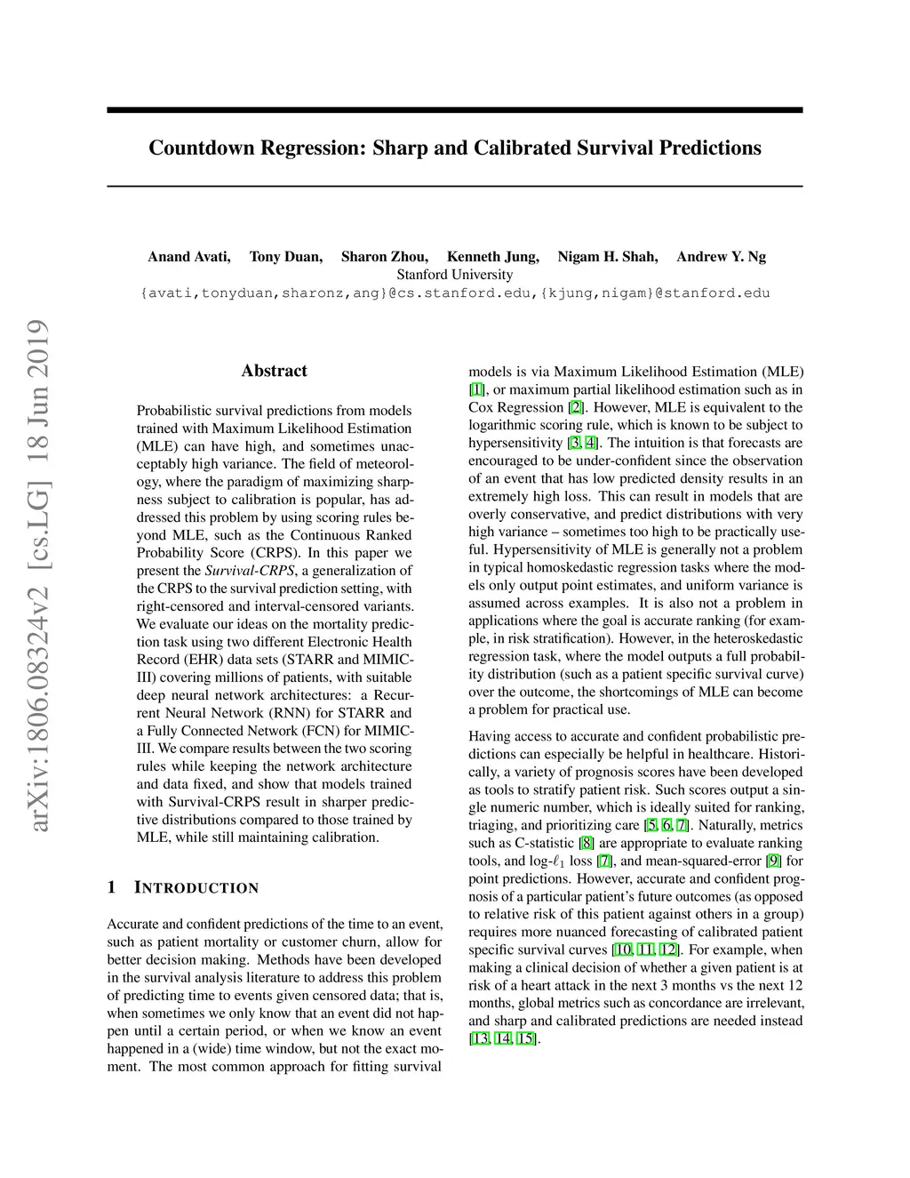 Probabilistic survival predictions from models trained with Maximum Likelihood Estimation (MLE) can have high, and sometimes unacceptably high variance. The field of meteorology, where the paradigm of maximizing sharpness subject to calibration is popular, has addressed this problem by using scoring rules beyond MLE, such as the Continuous Ranked Probability Score (CRPS). In this paper we present the \emph{Survival-CRPS}, a generalization of the CRPS to the survival prediction setting, with right-censored and interval-censored variants. We evaluate our ideas on the mortality prediction task using two different Electronic Health Record (EHR) data sets (STARR and MIMIC-III) covering millions of patients, with suitable deep neural network architectures: a Recurrent Neural Network (RNN) for STARR and a Fully Connected Network (FCN) for MIMIC-III. We compare results between the two scoring rules while keeping the network architecture and data fixed, and show that models trained with Survival-CRPS result in sharper predictive distributions compared to those trained by MLE, while still maintaining calibration.