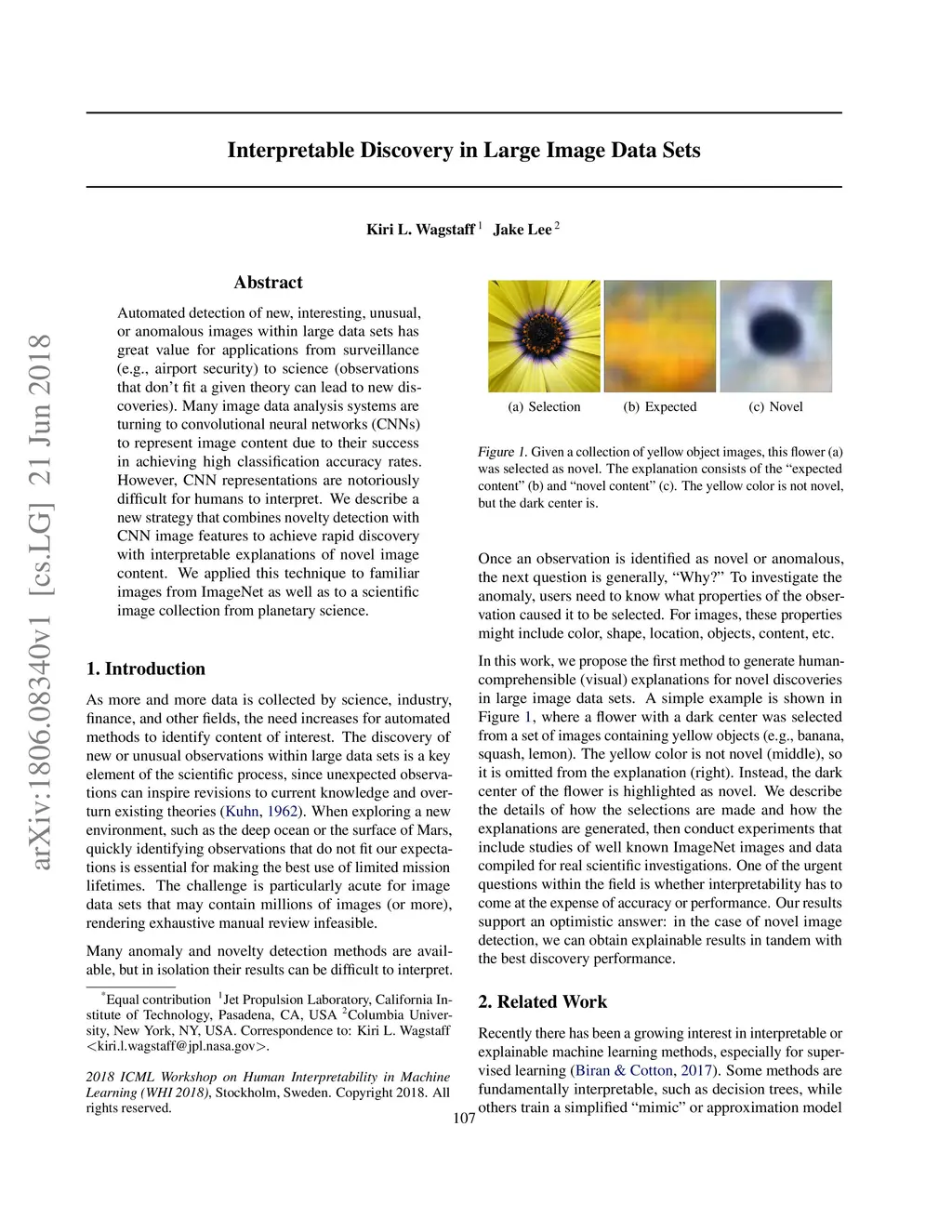 Automated detection of new, interesting, unusual, or anomalous images within large data sets has great value for applications from surveillance (e.g., airport security) to science (observations that don't fit a given theory can lead to new discoveries). Many image data analysis systems are turning to convolutional neural networks (CNNs) to represent image content due to their success in achieving high classification accuracy rates. However, CNN representations are notoriously difficult for humans to interpret. We describe a new strategy that combines novelty detection with CNN image features to achieve rapid discovery with interpretable explanations of novel image content. We applied this technique to familiar images from ImageNet as well as to a scientific image collection from planetary science.