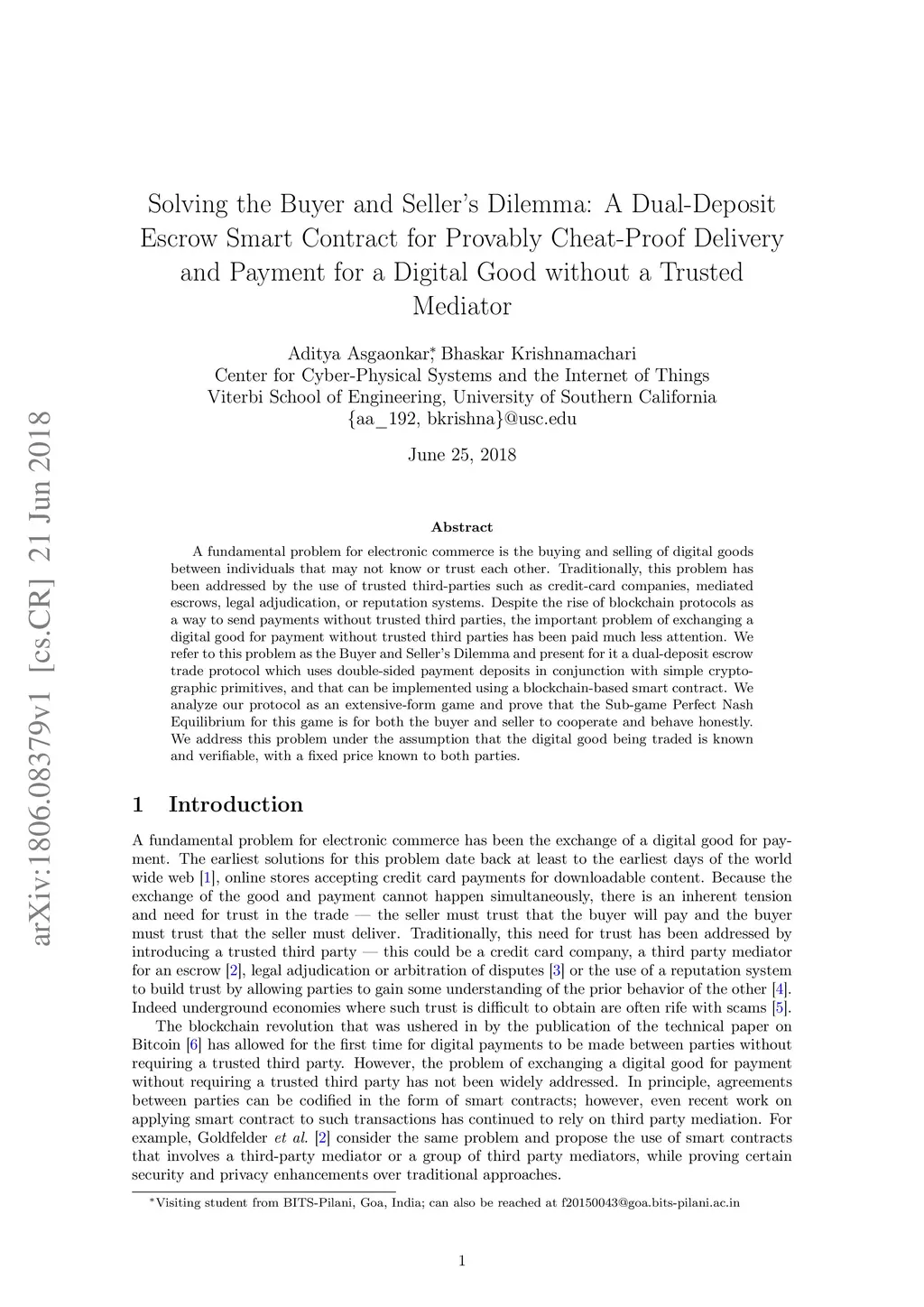 A fundamental problem for electronic commerce is the buying and selling of digital goods between individuals that may not know or trust each other. Traditionally, this problem has been addressed by the use of trusted third-parties such as credit-card companies, mediated escrows, legal adjudication, or reputation systems. Despite the rise of blockchain protocols as a way to send payments without trusted third parties, the important problem of exchanging a digital good for payment without trusted third parties has been paid much less attention. We refer to this problem as the Buyer and Seller's Dilemma and present for it a dual-deposit escrow trade protocol which uses double-sided payment deposits in conjunction with simple cryptographic primitives, and that can be implemented using a blockchain-based smart contract. We analyze our protocol as an extensive-form game and prove that the Sub-game Perfect Nash Equilibrium for this game is for both the buyer and seller to cooperate and behave honestly. We address this problem under the assumption that the digital good being traded is known and verifiable, with a fixed price known to both parties.