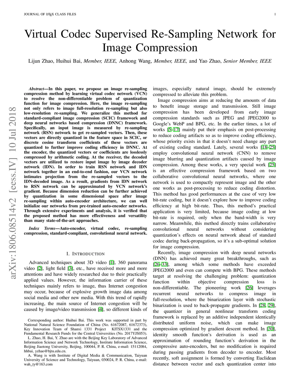 In this paper, we propose an image re-sampling compression method by learning virtual codec network (VCN) to resolve the non-differentiable problem of quantization function for image compression. Here, the image re-sampling not only refers to image full-resolution re-sampling but also low-resolution re-sampling. We generalize this method for standard-compliant image compression (SCIC) framework and deep neural networks based compression (DNNC) framework. Specifically, an input image is measured by re-sampling network (RSN) network to get re-sampled vectors. Then, these vectors are directly quantized in the feature space in SCIC, or discrete cosine transform coefficients of these vectors are quantized to further improve coding efficiency in DNNC. At the encoder, the quantized vectors or coefficients are losslessly compressed by arithmetic coding. At the receiver, the decoded vectors are utilized to restore input image by image decoder network (IDN). In order to train RSN network and IDN network together in an end-to-end fashion, our VCN network intimates projection from the re-sampled vectors to the IDN-decoded image. As a result, gradients from IDN network to RSN network can be approximated by VCN network's gradient. Because dimension reduction can be further achieved by quantization in some dimensional space after image re-sampling within auto-encoder architecture, we can well initialize our networks from pre-trained auto-encoder networks. Through extensive experiments and analysis, it is verified that the proposed method has more effectiveness and versatility than many state-of-the-art approaches.