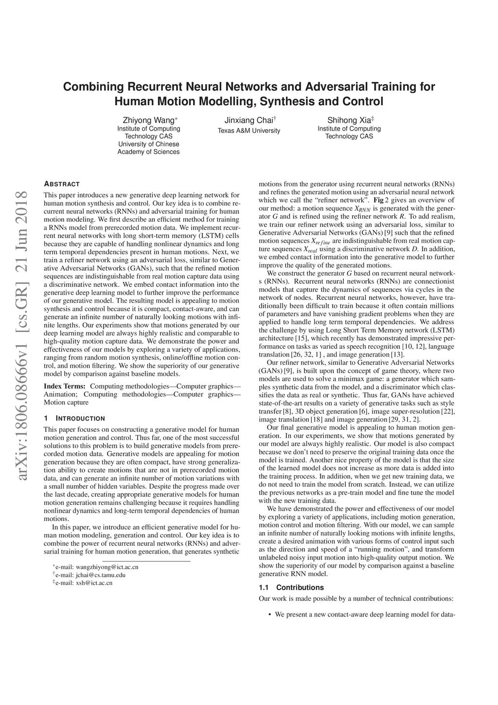 This paper introduces a new generative deep learning network for human motion synthesis and control. Our key idea is to combine recurrent neural networks (RNNs) and adversarial training for human motion modeling. We first describe an efficient method for training a RNNs model from prerecorded motion data. We implement recurrent neural networks with long short-term memory (LSTM) cells because they are capable of handling nonlinear dynamics and long term temporal dependencies present in human motions. Next, we train a refiner network using an adversarial loss, similar to Generative Adversarial Networks (GANs), such that the refined motion sequences are indistinguishable from real motion capture data using a discriminative network. We embed contact information into the generative deep learning model to further improve the performance of our generative model. The resulting model is appealing to motion synthesis and control because it is compact, contact-aware, and can generate an infinite number of naturally looking motions with infinite lengths. Our experiments show that motions generated by our deep learning model are always highly realistic and comparable to high-quality motion capture data. We demonstrate the power and effectiveness of our models by exploring a variety of applications, ranging from random motion synthesis, online/offline motion control, and motion filtering. We show the superiority of our generative model by comparison against baseline models.