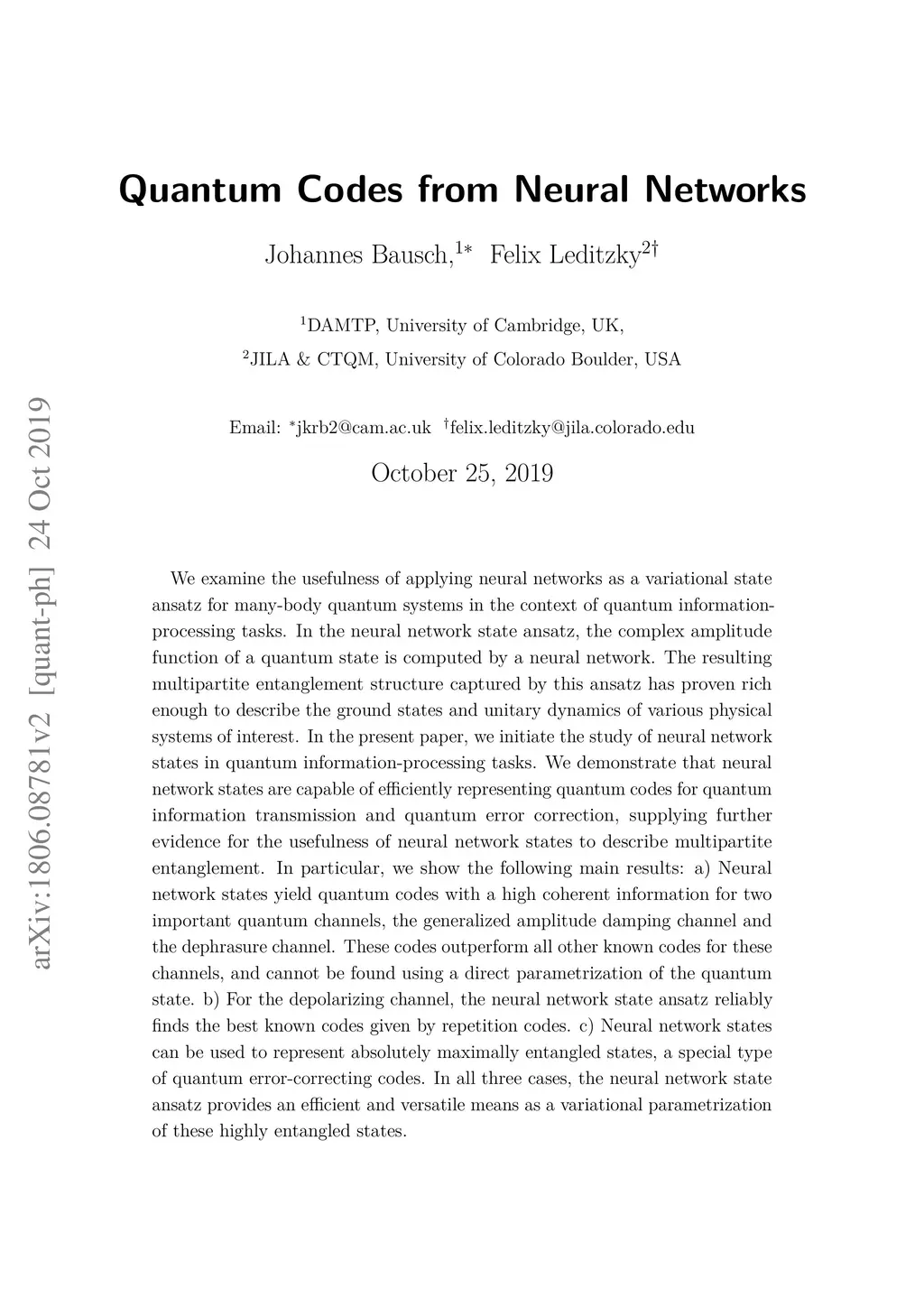 We examine the usefulness of applying neural networks as a variational state ansatz for many-body quantum systems in the context of quantum information-processing tasks. In the neural network state ansatz, the complex amplitude function of a quantum state is computed by a neural network. The resulting multipartite entanglement structure captured by this ansatz has proven rich enough to describe the ground states and unitary dynamics of various physical systems of interest. In the present paper, we initiate the study of neural network states in quantum information-processing tasks. We demonstrate that neural network states are capable of efficiently representing quantum codes for quantum information transmission and quantum error correction, supplying further evidence for the usefulness of neural network states to describe multipartite entanglement. In particular, we show the following main results: a) Neural network states yield quantum codes with a high coherent information for two important quantum channels, the generalized amplitude damping channel and the dephrasure channel. These codes outperform all other known codes for these channels, and cannot be found using a direct parametrization of the quantum state. b) For the depolarizing channel, the neural network state ansatz reliably finds the best known codes given by repetition codes. c) Neural network states can be used to represent absolutely maximally entangled states, a special type of quantum error-correcting codes. In all three cases, the neural network state ansatz provides an efficient and versatile means as a variational parametrization of these highly entangled states.