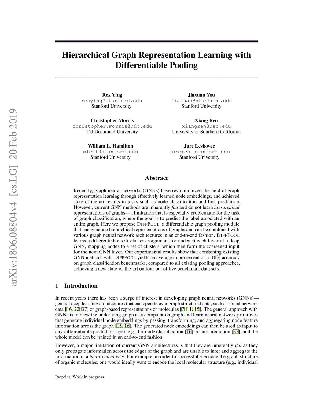 Hierarchical Graph Representation Learning with Differentiable Pooling