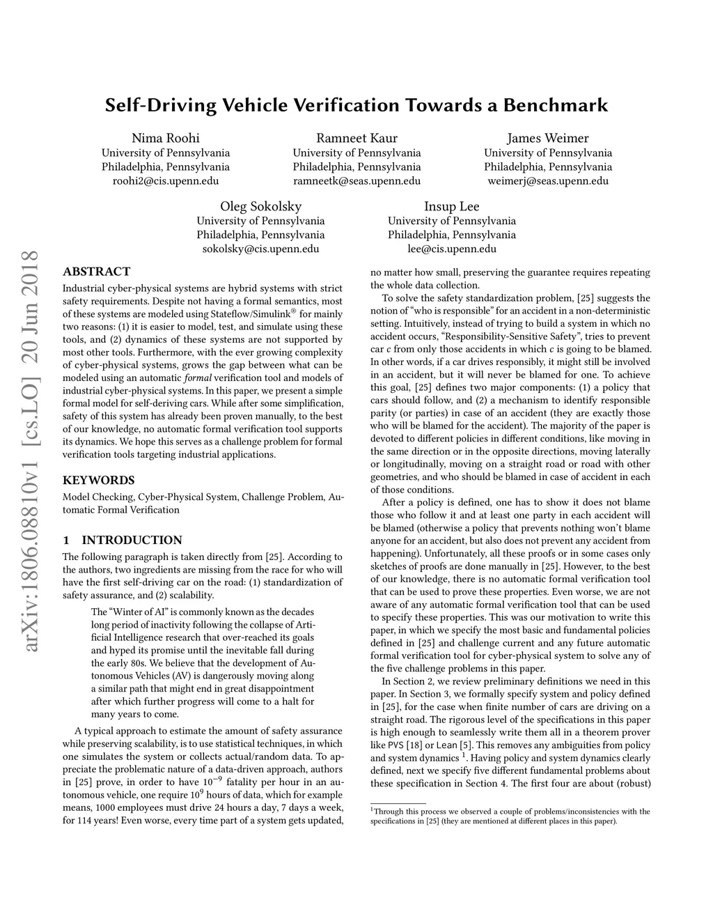 Industrial cyber-physical systems are hybrid systems with strict safety requirements. Despite not having a formal semantics, most of these systems are modeled using Stateflow/Simulink for mainly two reasons: (1) it is easier to model, test, and simulate using these tools, and (2) dynamics of these systems are not supported by most other tools. Furthermore, with the ever growing complexity of cyber-physical systems, grows the gap between what can be modeled using an automatic formal verification tool and models of industrial cyber-physical systems. In this paper, we present a simple formal model for self-deriving cars. While after some simplification, safety of this system has already been proven manually, to the best of our knowledge, no automatic formal verification tool supports its dynamics. We hope this serves as a challenge problem for formal verification tools targeting industrial applications.