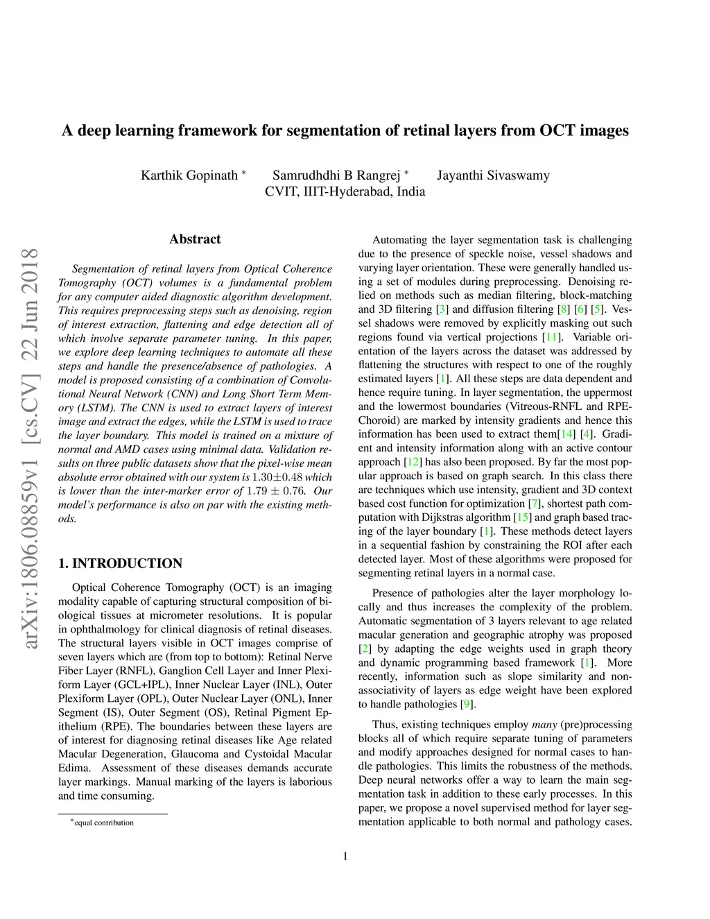 Segmentation of retinal layers from Optical Coherence Tomography (OCT) volumes is a fundamental problem for any computer aided diagnostic algorithm development. This requires preprocessing steps such as denoising, region of interest extraction, flattening and edge detection all of which involve separate parameter tuning. In this paper, we explore deep learning techniques to automate all these steps and handle the presence/absence of pathologies. A model is proposed consisting of a combination of Convolutional Neural Network (CNN) and Long Short Term Memory (LSTM). The CNN is used to extract layers of interest image and extract the edges, while the LSTM is used to trace the layer boundary. This model is trained on a mixture of normal and AMD cases using minimal data. Validation results on three public datasets show that the pixel-wise mean absolute error obtained with our system is 1.30 plus or minus 0.48 which is lower than the inter-marker error of 1.79 plus or minus 0.76. Our model's performance is also on par with the existing methods.