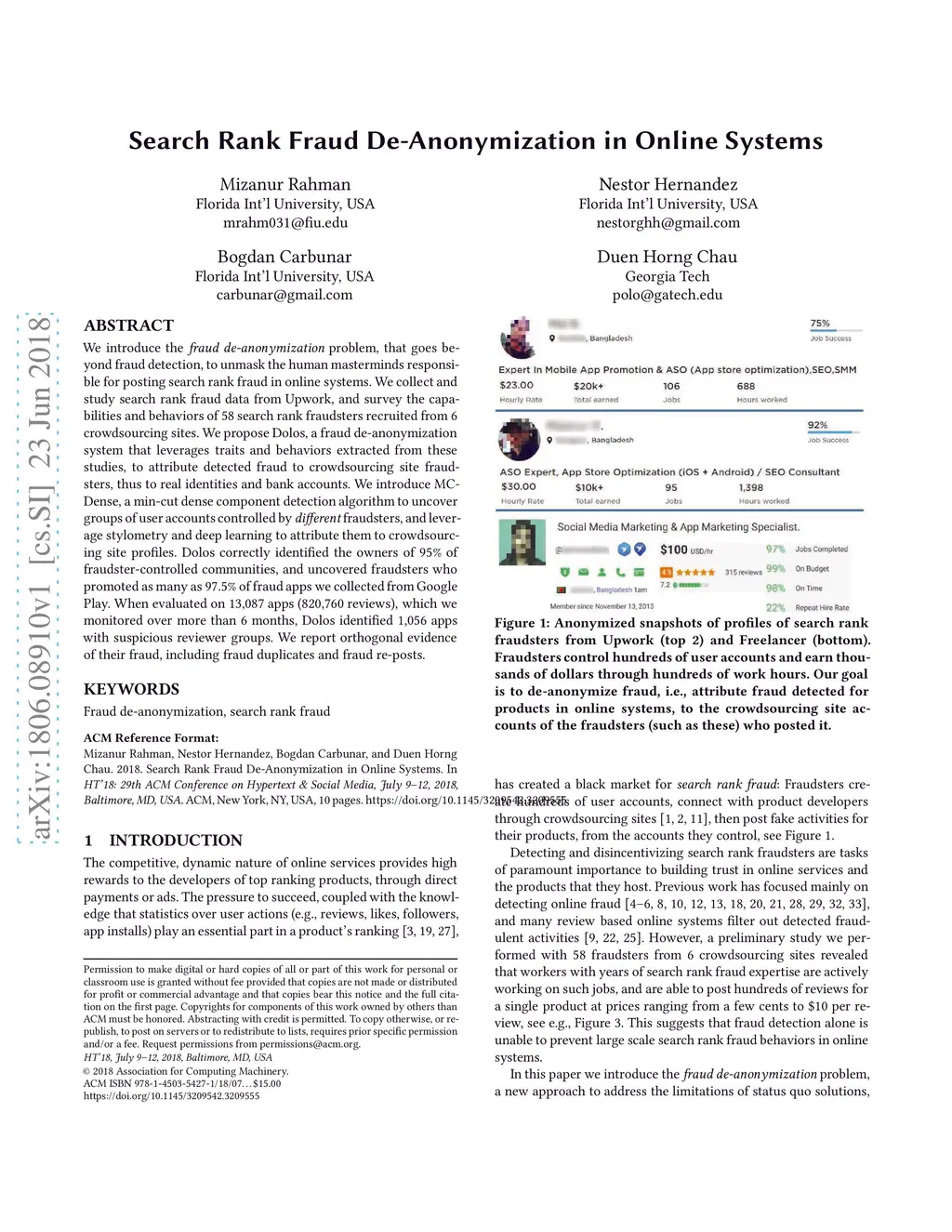 We introduce the fraud de-anonymization problem, that goes beyond fraud detection, to unmask the human masterminds responsible for posting search rank fraud in online systems. We collect and study search rank fraud data from Upwork, and survey the capabilities and behaviors of 58 search rank fraudsters recruited from 6 crowdsourcing sites. We propose Dolos, a fraud de-anonymization system that leverages traits and behaviors extracted from these studies, to attribute detected fraud to crowdsourcing site fraudsters, thus to real identities and bank accounts. We introduce MCDense, a min-cut dense component detection algorithm to uncover groups of user accounts controlled by different fraudsters, and leverage stylometry and deep learning to attribute them to crowdsourcing site profiles. Dolos correctly identified the owners of 95% of fraudster-controlled communities, and uncovered fraudsters who promoted as many as 97.5% of fraud apps we collected from Google Play. When evaluated on 13,087 apps (820,760 reviews), which we monitored over more than 6 months, Dolos identified 1,056 apps with suspicious reviewer groups. We report orthogonal evidence of their fraud, including fraud duplicates and fraud re-posts.