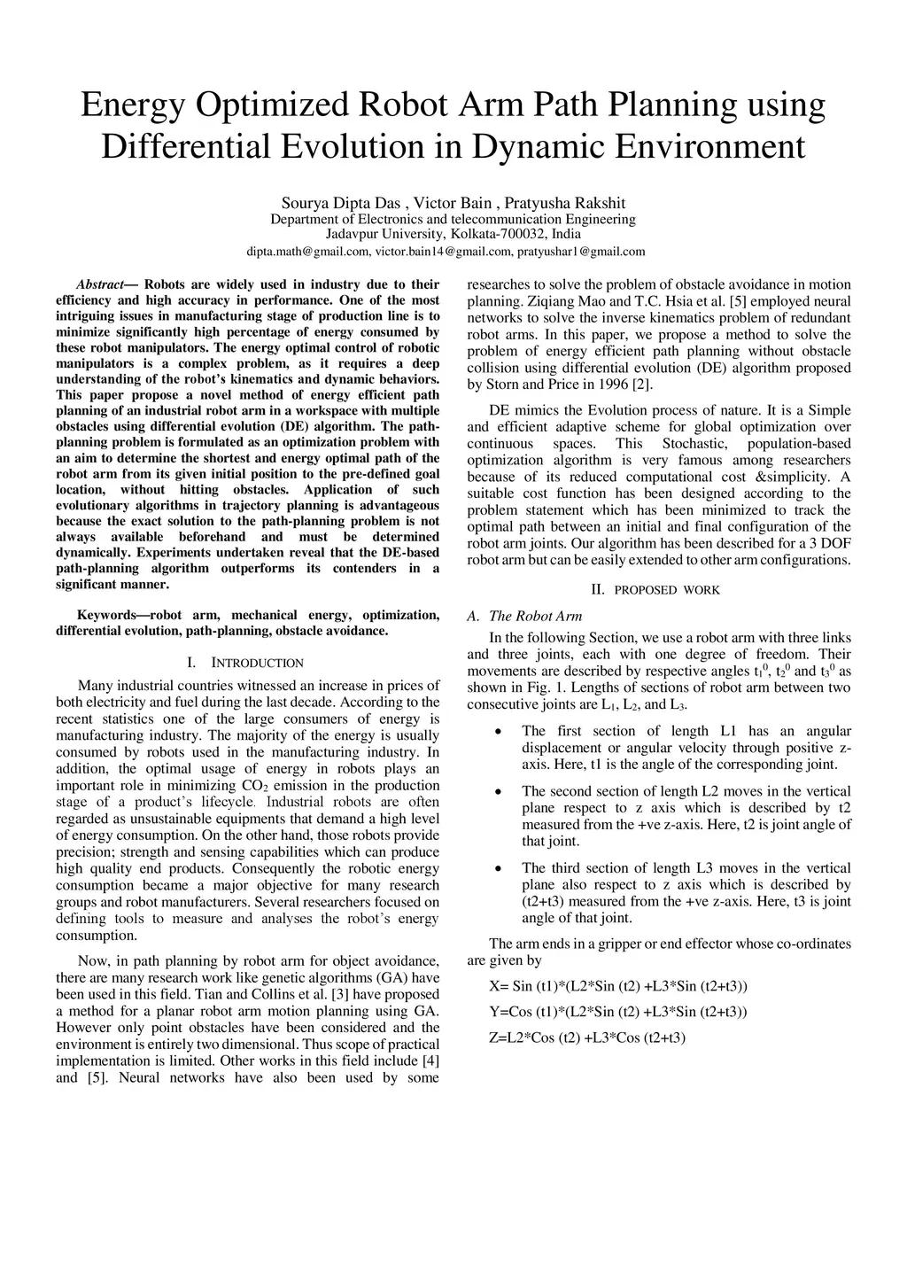 Energy Optimized Robot Arm Path Planning using Differential Evolution in