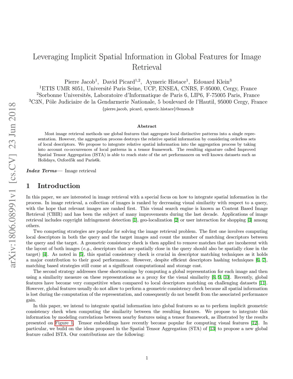 Most image retrieval methods use global features that aggregate local distinctive patterns into a single representation. However, the aggregation process destroys the relative spatial information by considering orderless sets of local descriptors. We propose to integrate relative spatial information into the aggregation process by taking into account co-occurrences of local patterns in a tensor framework. The resulting signature called Improved Spatial Tensor Aggregation (ISTA) is able to reach state of the art performances on well known datasets such as Holidays, Oxford5k and Paris6k.