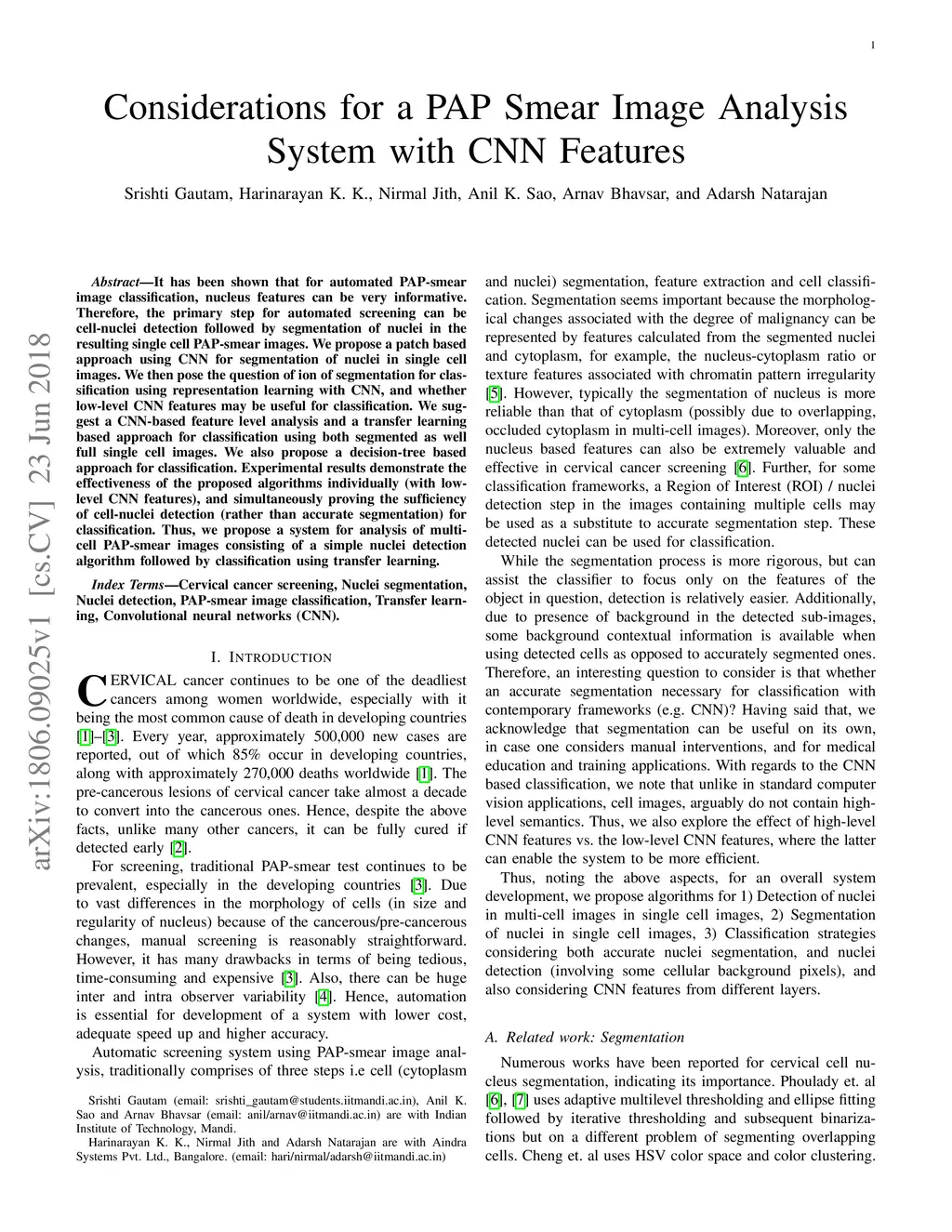 It has been shown that for automated PAP-smear image classification, nucleus features can be very informative. Therefore, the primary step for automated screening can be cell-nuclei detection followed by segmentation of nuclei in the resulting single cell PAP-smear images. We propose a patch based approach using CNN for segmentation of nuclei in single cell images. We then pose the question of ion of segmentation for classification using representation learning with CNN, and whether low-level CNN features may be useful for classification. We suggest a CNN-based feature level analysis and a transfer learning based approach for classification using both segmented as well full single cell images. We also propose a decision-tree based approach for classification. Experimental results demonstrate the effectiveness of the proposed algorithms individually (with low-level CNN features), and simultaneously proving the sufficiency of cell-nuclei detection (rather than accurate segmentation) for classification. Thus, we propose a system for analysis of multi-cell PAP-smear images consisting of a simple nuclei detection algorithm followed by classification using transfer learning.