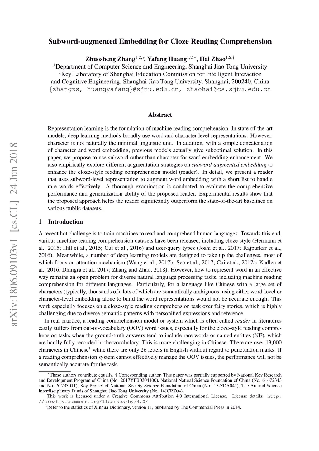 Subword-augmented Embedding for Cloze Reading Comprehension