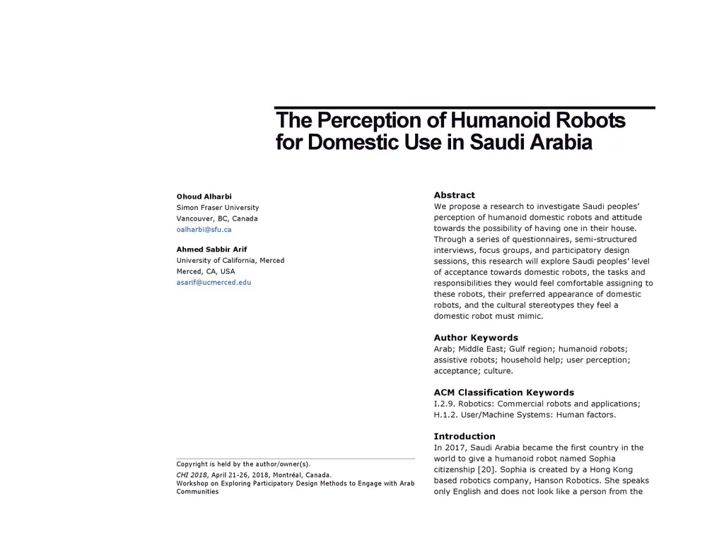 The Perception of Humanoid Robots for Domestic Use in Saudi Arabia