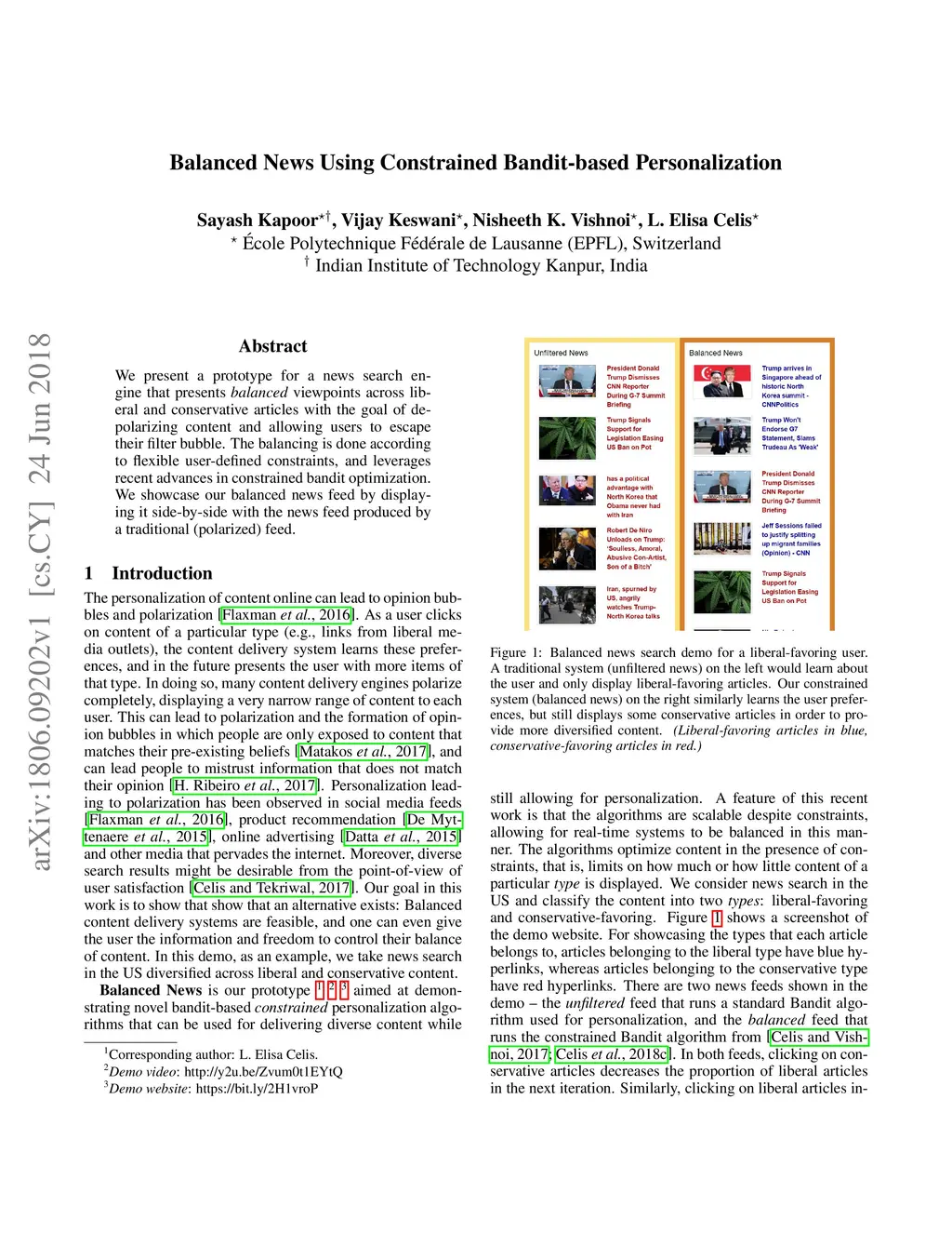 We present a prototype for a news search engine that presents balanced viewpoints across liberal and conservative articles with the goal of de-polarizing content and allowing users to escape their filter bubble. The balancing is done according to flexible user-defined constraints, and leverages recent advances in constrained bandit optimization. We showcase our balanced news feed by displaying it side-by-side with the news feed produced by a traditional (polarized) feed.