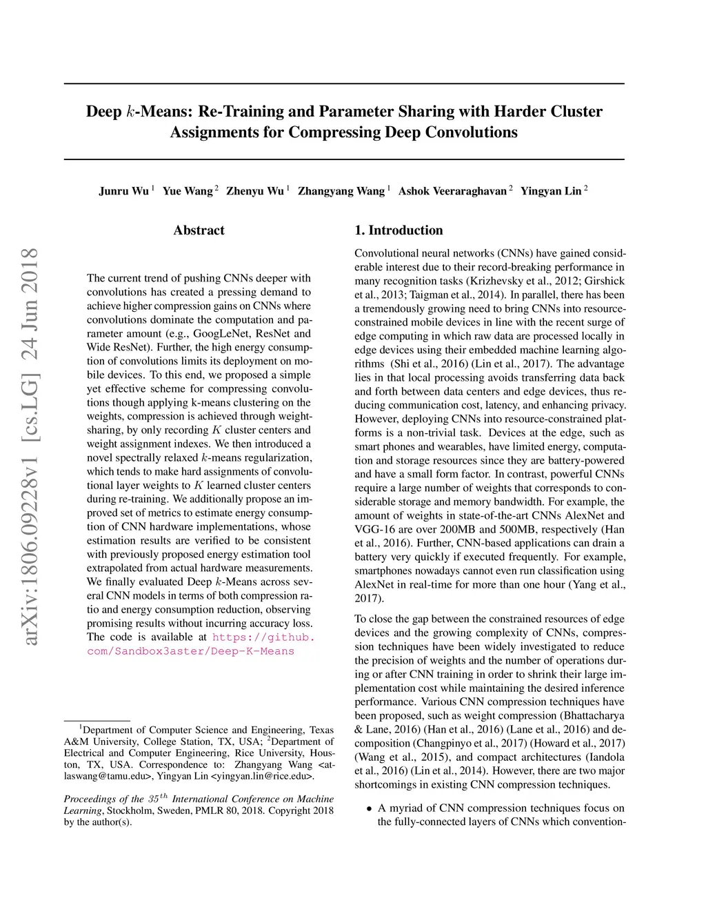 The current trend of pushing CNNs deeper with convolutions has created a pressing demand to achieve higher compression gains on CNNs where convolutions dominate the computation and parameter amount (e.g., GoogLeNet, ResNet and Wide ResNet). Further, the high energy consumption of convolutions limits its deployment on mobile devices. To this end, we proposed a simple yet effective scheme for compressing convolutions though applying k-means clustering on the weights, compression is achieved through weight-sharing, by only recording cluster centers and weight assignment indexes. We then introduced a novel spectrally relaxed -means regularization, which tends to make hard assignments of convolutional layer weights to learned cluster centers during re-training. We additionally propose an improved set of metrics to estimate energy consumption of CNN hardware implementations, whose estimation results are verified to be consistent with previously proposed energy estimation tool extrapolated from actual hardware measurements. We finally evaluated Deep -Means across several CNN models in terms of both compression ratio and energy consumption reduction, observing promising results without incurring accuracy loss. The code is available at https://github.com/Sandbox3aster/Deep-K-Means