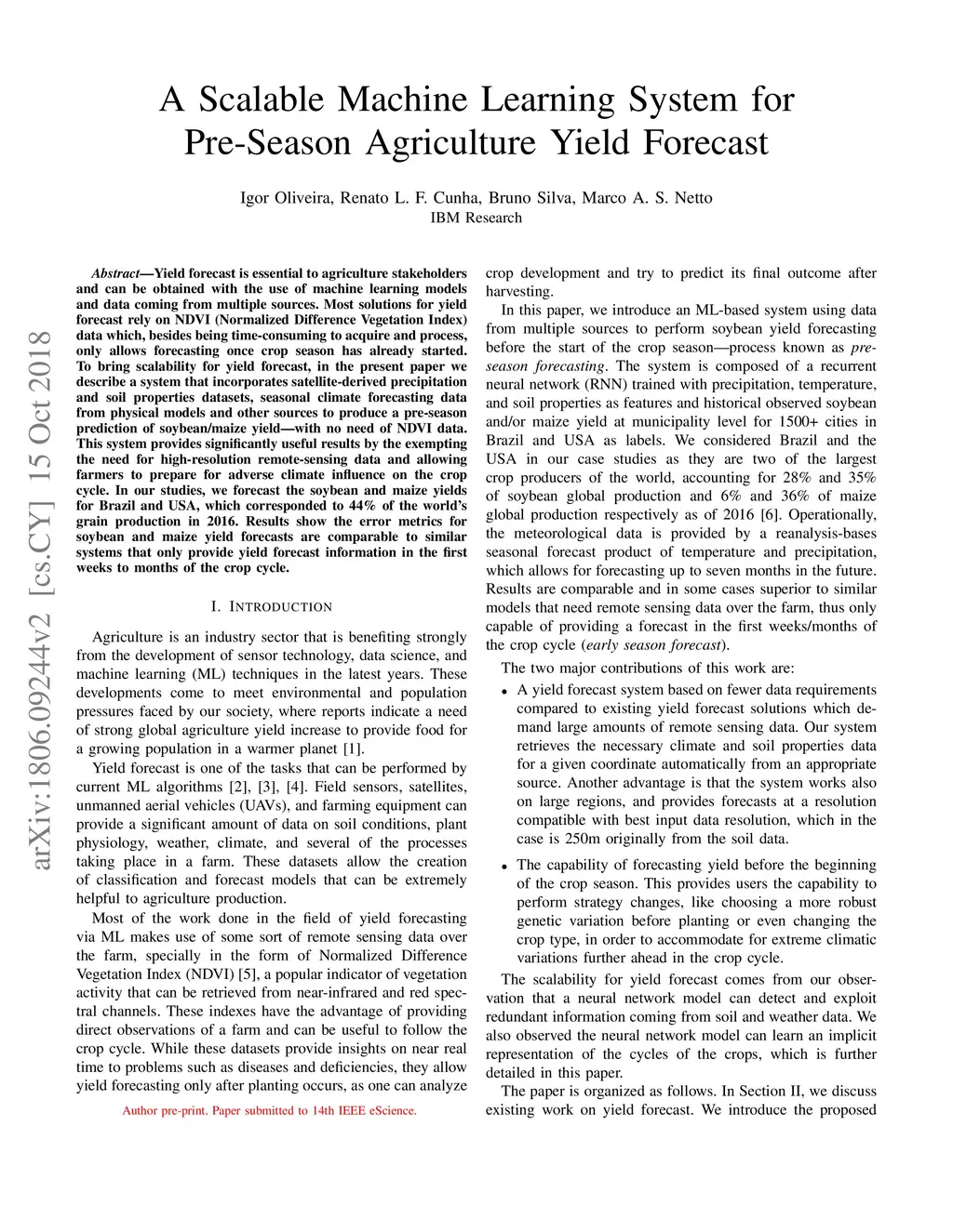 Yield forecast is essential to agriculture stakeholders and can be obtained with the use of machine learning models and data coming from multiple sources. Most solutions for yield forecast rely on NDVI (Normalized Difference Vegetation Index) data, which is time-consuming to be acquired and processed. To bring scalability for yield forecast, in the present paper we describe a system that incorporates satellite-derived precipitation and soil properties datasets, seasonal climate forecasting data from physical models and other sources to produce a pre-season prediction of soybean/maize yield---with no need of NDVI data. This system provides significantly useful results by the exempting the need for high-resolution remote-sensing data and allowing farmers to prepare for adverse climate influence on the crop cycle. In our studies, we forecast the soybean and maize yields for Brazil and USA, which corresponded to 44% of the world's grain production in 2016. Results show the error metrics for soybean and maize yield forecasts are comparable to similar systems that only provide yield forecast information in the first weeks to months of the crop cycle.