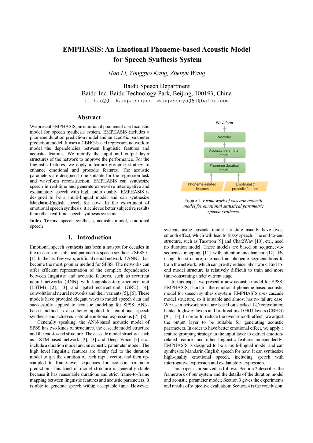 We present EMPHASIS, an emotional phoneme-based acoustic model for speech synthesis system. EMPHASIS includes a phoneme duration prediction model and an acoustic parameter prediction model. It uses a CBHG-based regression network to model the dependencies between linguistic features and acoustic features. We modify the input and output layer structures of the network to improve the performance. For the linguistic features, we apply a feature grouping strategy to enhance emotional and prosodic features. The acoustic parameters are designed to be suitable for the regression task and waveform reconstruction. EMPHASIS can synthesize speech in real-time and generate expressive interrogative and exclamatory speech with high audio quality. EMPHASIS is designed to be a multi-lingual model and can synthesize Mandarin-English speech for now. In the experiment of emotional speech synthesis, it achieves better subjective results than other real-time speech synthesis systems.