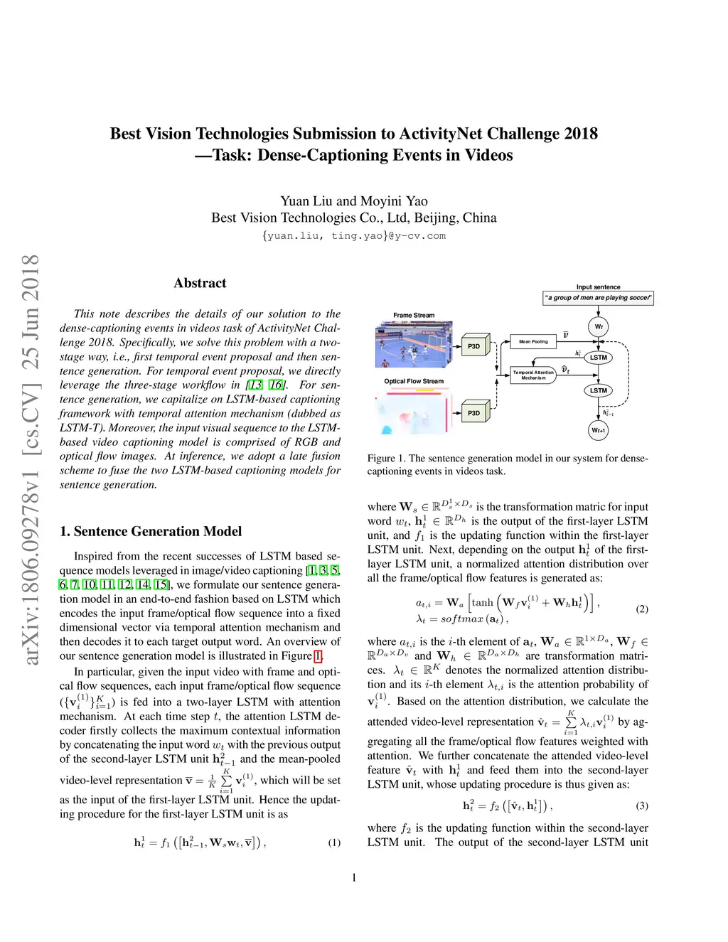 This note describes the details of our solution to the dense-captioning events in videos task of ActivityNet Challenge 2018. Specifically, we solve this problem with a two-stage way, i.e., first temporal event proposal and then sentence generation. For temporal event proposal, we directly leverage the three-stage workflow in [13, 16]. For sentence generation, we capitalize on LSTM-based captioning framework with temporal attention mechanism (dubbed as LSTM-T). Moreover, the input visual sequence to the LSTM-based video captioning model is comprised of RGB and optical flow images. At inference, we adopt a late fusion scheme to fuse the two LSTM-based captioning models for sentence generation.