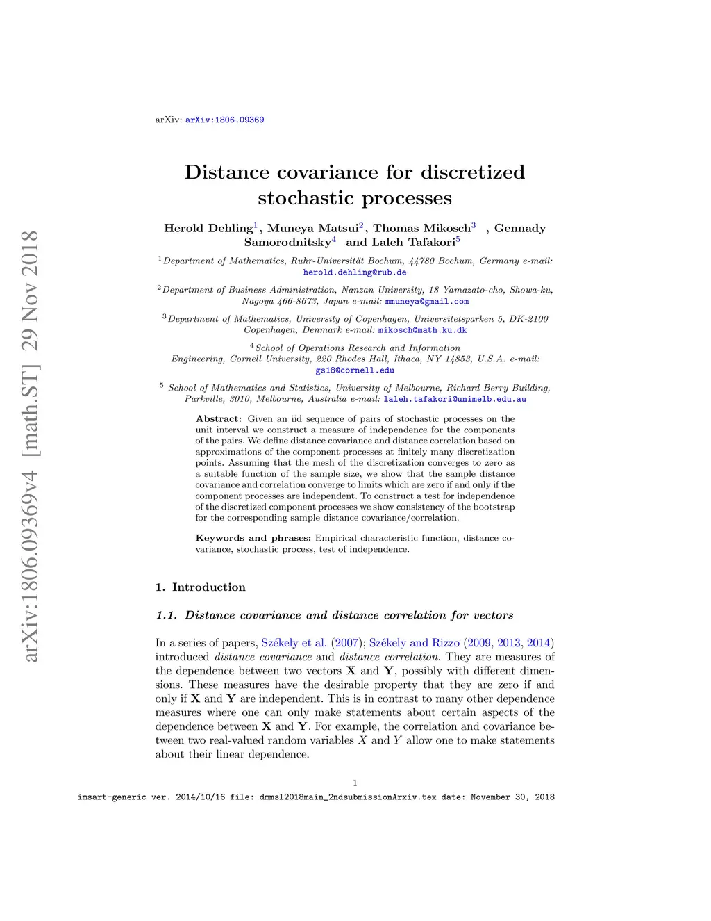 Given an iid sequence of pairs of stochastic processes on the unit interval we construct a measure of independence for the components of the pairs. We define distance covariance and distance correlation based on approximations of the component processes at finitely many discretization points. Assuming that the mesh of the discretization converges to zero as a suitable function of the sample size, we show that the sample distance covariance and correlation converge to limits which are zero if and only if the component processes are independent. To construct a test for independence of the discretized component processes we show consistency of the bootstrap for the corresponding sample distance covariance/correlation.