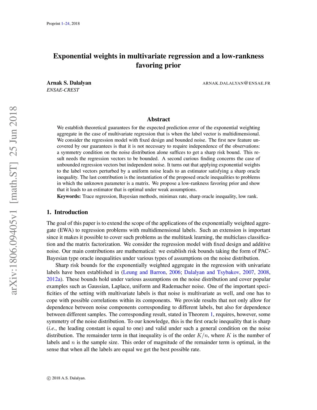 We establish theoretical guarantees for the expected prediction error of the exponential weighting aggregate in the case of multivariate regression that is when the label vector is multidimensional. We consider the regression model with fixed design and bounded noise. The first new feature uncovered by our guarantees is that it is not necessary to require independence of the observations: a symmetry condition on the noise distribution alone suffices to get a sharp risk bound. This result needs the regression vectors to be bounded. A second curious finding concerns the case of unbounded regression vectors but independent noise. It turns out that applying exponential weights to the label vectors perturbed by a uniform noise leads to an estimator satisfying a sharp oracle inequality. The last contribution is the instantiation of the proposed oracle inequalities to problems in which the unknown parameter is a matrix. We propose a low-rankness favoring prior and show that it leads to an estimator that is optimal under weak assumptions.