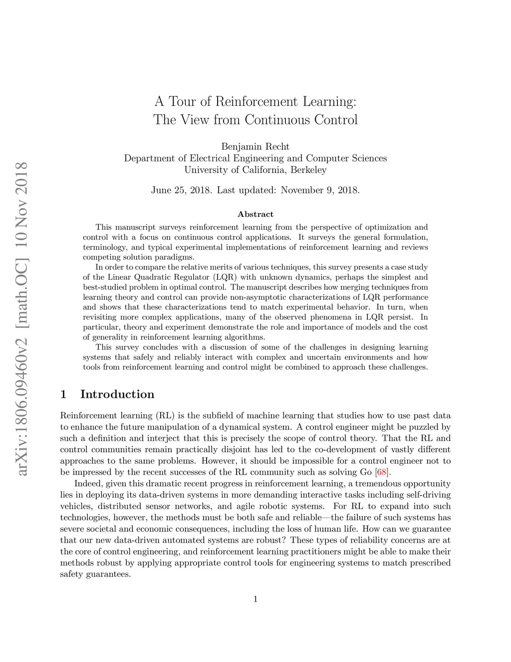 This manuscript surveys reinforcement learning from the perspective of optimization and control with a focus on continuous control applications. It surveys the general formulation, terminology, and typical experimental implementations of reinforcement learning and reviews competing solution paradigms. In order to compare the relative merits of various techniques, this survey presents a case study of the Linear Quadratic Regulator (LQR) with unknown dynamics, perhaps the simplest and best-studied problem in optimal control. The manuscript describes how merging techniques from learning theory and control can provide non-asymptotic characterizations of LQR performance and shows that these characterizations tend to match experimental behavior. In turn, when revisiting more complex applications, many of the observed phenomena in LQR persist. In particular, theory and experiment demonstrate the role and importance of models and the cost of generality in reinforcement learning algorithms. This survey concludes with a discussion of some of the challenges in designing learning systems that safely and reliably interact with complex and uncertain environments and how tools from reinforcement learning and control might be combined to approach these challenges.