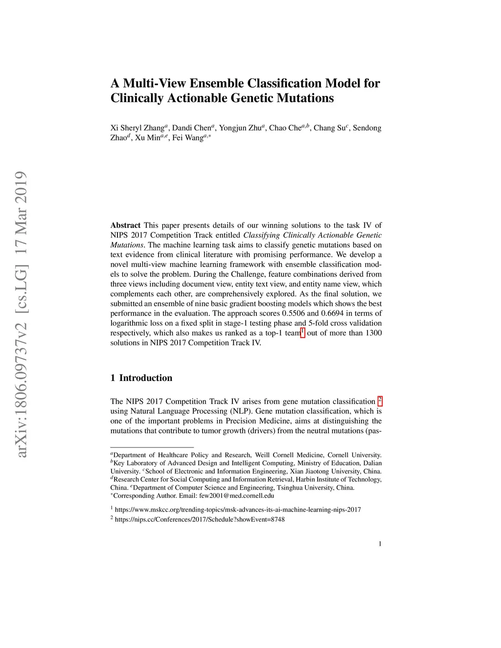 This paper presents details of our winning solutions to the task IV of NIPS 2017 Competition Track entitled Classifying Clinically Actionable Genetic Mutations. The machine learning task aims to classify genetic mutations based on text evidence from clinical literature with promising performance. We develop a novel multi-view machine learning framework with ensemble classification models to solve the problem. During the Challenge, feature combinations derived from three views including document view, entity text view, and entity name view, which complements each other, are comprehensively explored. As the final solution, we submitted an ensemble of nine basic gradient boosting models which shows the best performance in the evaluation. The approach scores 0.5506 and 0.6694 in terms of logarithmic loss on a fixed split in stage-1 testing phase and 5-fold cross validation respectively, which also makes us ranked as a top-1 team out of more than 1,300 solutions in NIPS 2017 Competition Track IV.