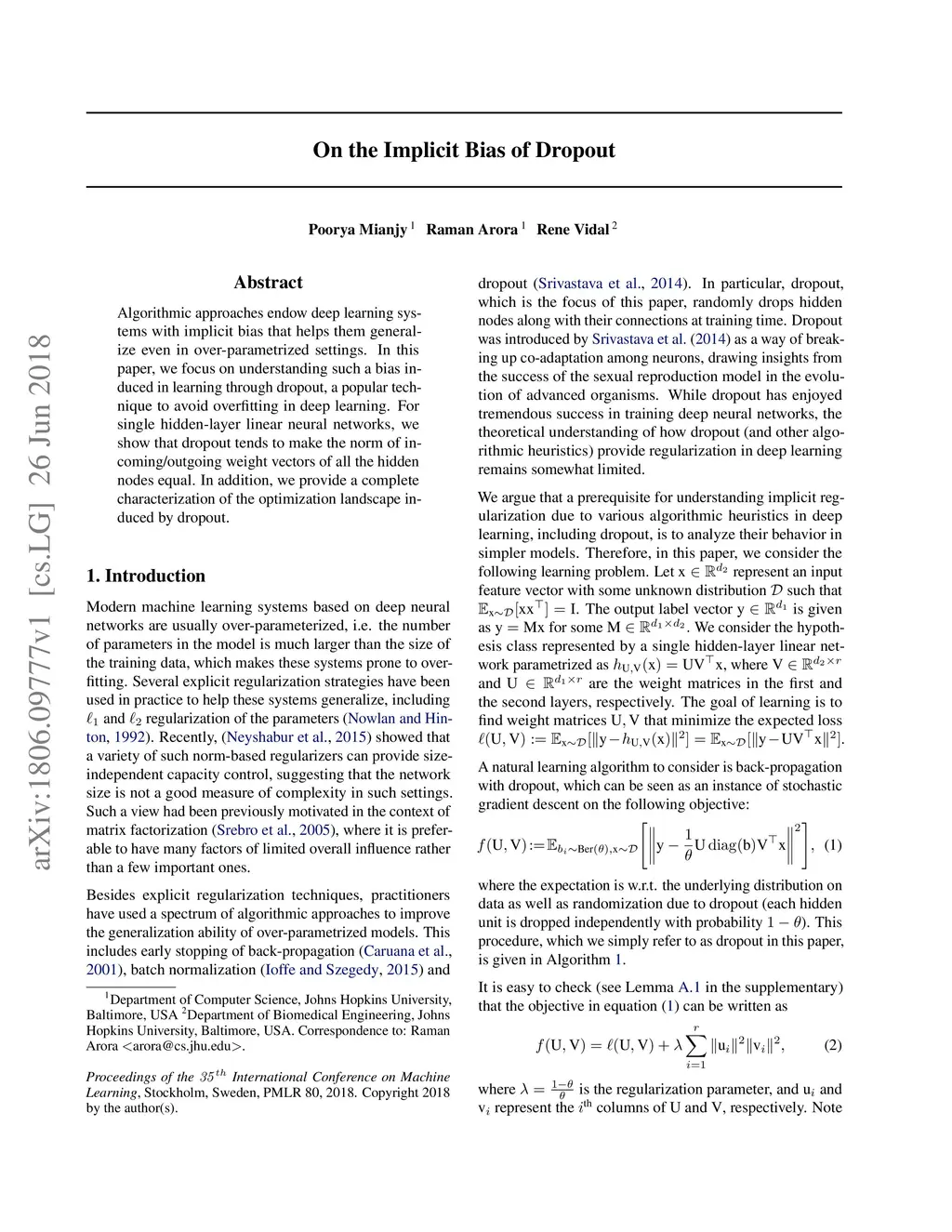 Algorithmic approaches endow deep learning systems with implicit bias that helps them generalize even in over-parametrized settings. In this paper, we focus on understanding such a bias induced in learning through dropout, a popular technique to avoid overfitting in deep learning. For single hidden-layer linear neural networks, we show that dropout tends to make the norm of incoming/outgoing weight vectors of all the hidden nodes equal. In addition, we provide a complete characterization of the optimization landscape induced by dropout.