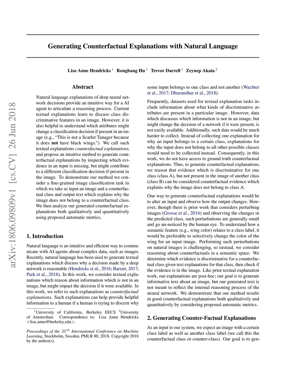 Natural language explanations of deep neural network decisions provide an intuitive way for a AI agent to articulate a reasoning process. Current textual explanations learn to discuss class discriminative features in an image. However, it is also helpful to understand which attributes might change a classification decision if present in an image (e.g., "This is not a Scarlet Tanager because it does not have black wings.") We call such textual explanations counterfactual explanations, and propose an intuitive method to generate counterfactual explanations by inspecting which evidence in an input is missing, but might contribute to a different classification decision if present in the image. To demonstrate our method we consider a fine-grained image classification task in which we take as input an image and a counterfactual class and output text which explains why the image does not belong to a counterfactual class. We then analyze our generated counterfactual explanations both qualitatively and quantitatively using proposed automatic metrics.
