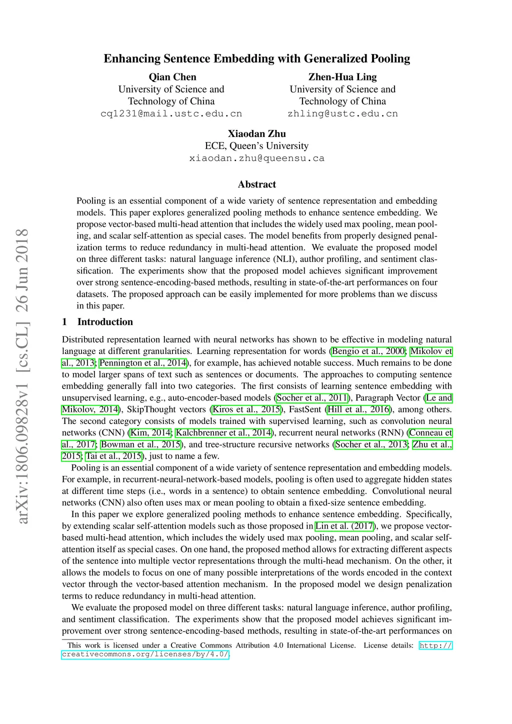 Pooling is an essential component of a wide variety of sentence representation and embedding models. This paper explores generalized pooling methods to enhance sentence embedding. We propose vector-based multi-head attention that includes the widely used max pooling, mean pooling, and scalar self-attention as special cases. The model benefits from properly designed penalization terms to reduce redundancy in multi-head attention. We evaluate the proposed model on three different tasks: natural language inference (NLI), author profiling, and sentiment classification. The experiments show that the proposed model achieves significant improvement over strong sentence-encoding-based methods, resulting in state-of-the-art performances on four datasets. The proposed approach can be easily implemented for more problems than we discuss in this paper.
