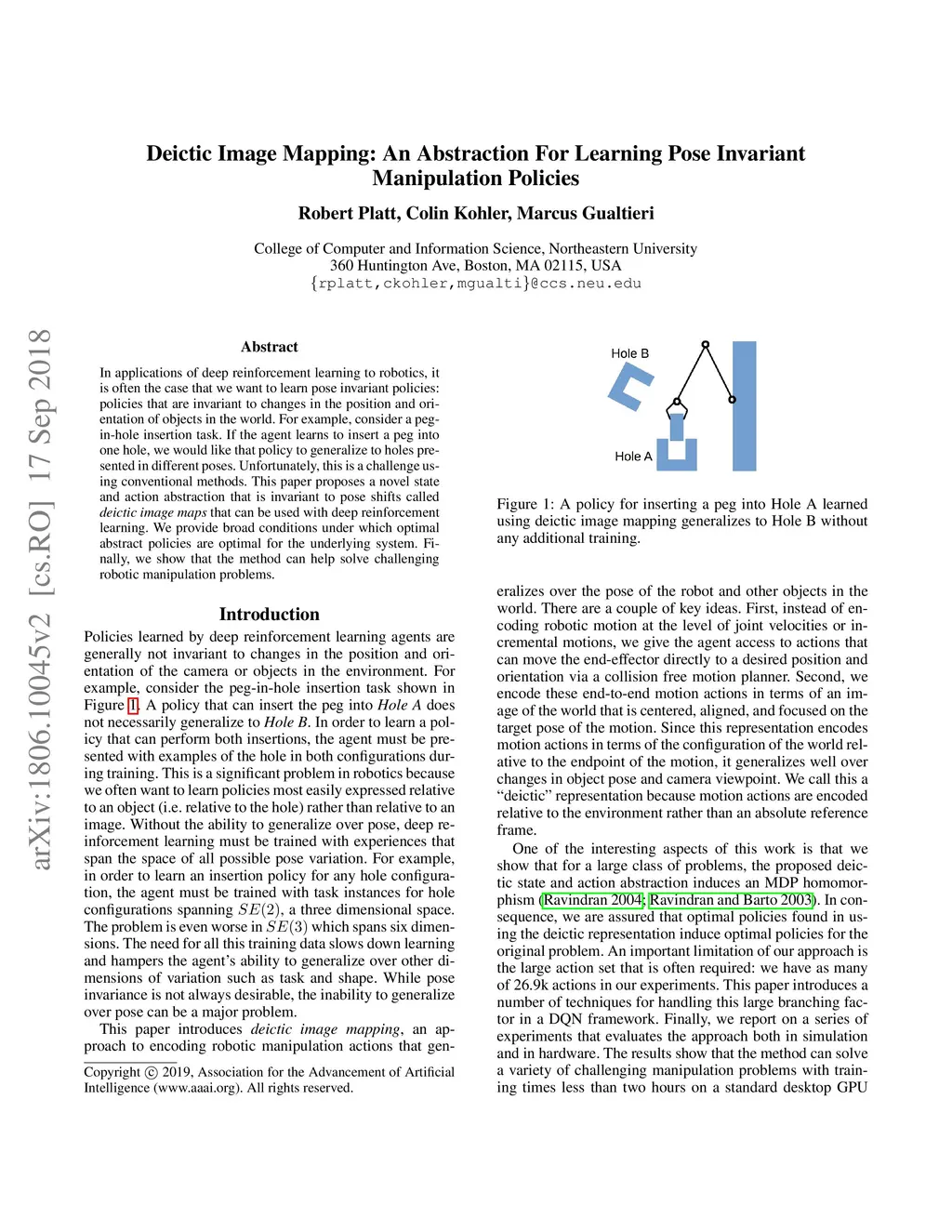 In applications of deep reinforcement learning to robotics, it is often the case that we want to learn pose invariant policies: policies that are invariant to changes in the position and orientation of objects in the world. For example, consider a peg-in-hole insertion task. If the agent learns to insert a peg into one hole, we would like that policy to generalize to holes presented in different poses. Unfortunately, this is a challenge using conventional methods. This paper proposes a novel state and action abstraction that is invariant to pose shifts called \textit{deictic image maps} that can be used with deep reinforcement learning. We provide broad conditions under which optimal abstract policies are optimal for the underlying system. Finally, we show that the method can help solve challenging robotic manipulation problems.