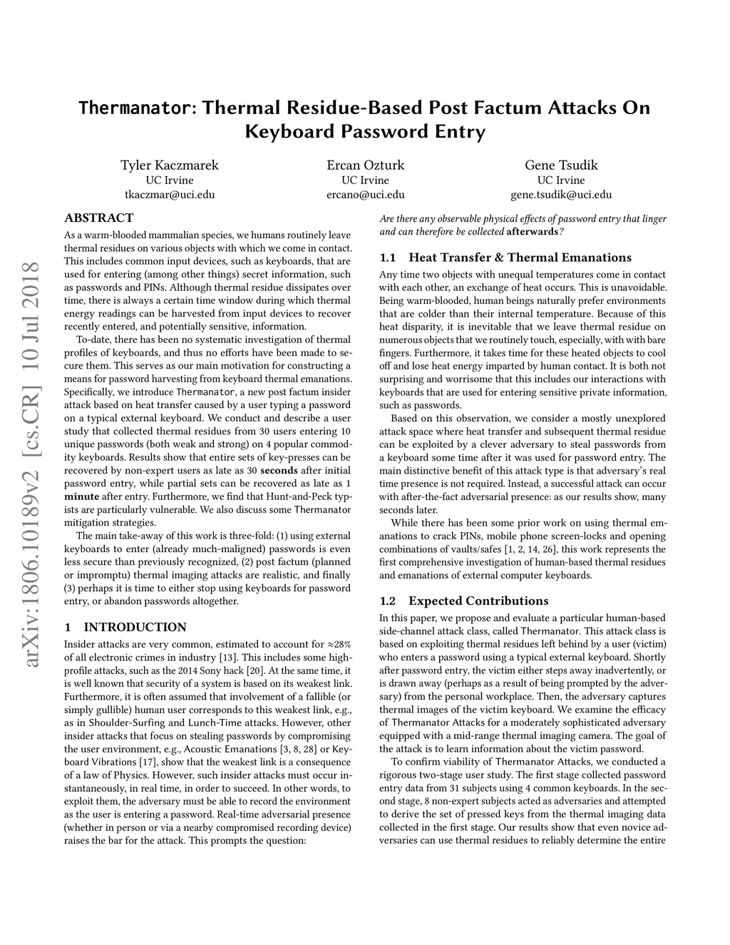 Thermanator: Thermal Residue-Based Post Factum Attacks On Keyboard